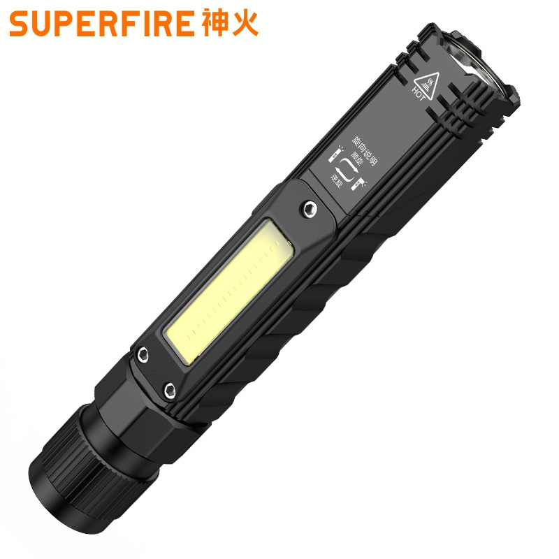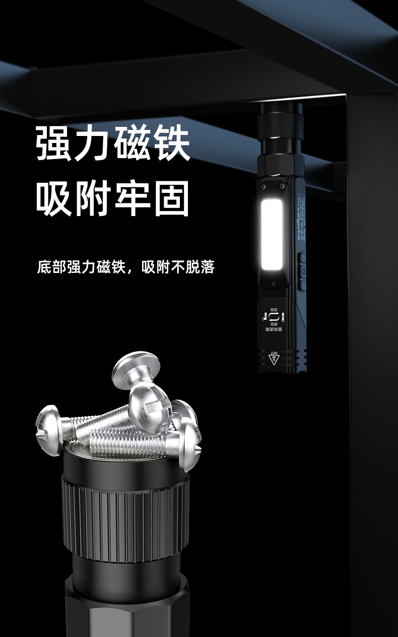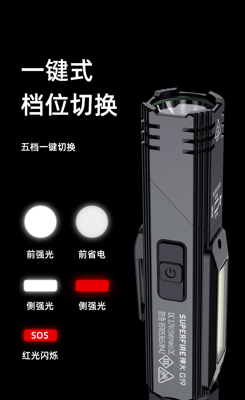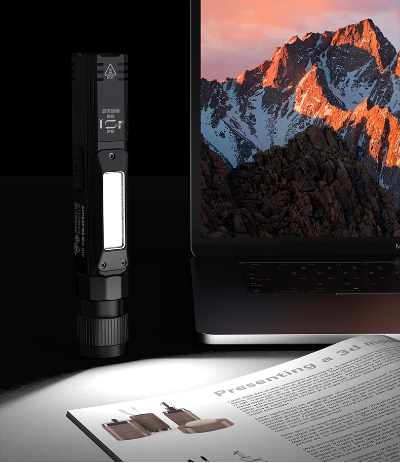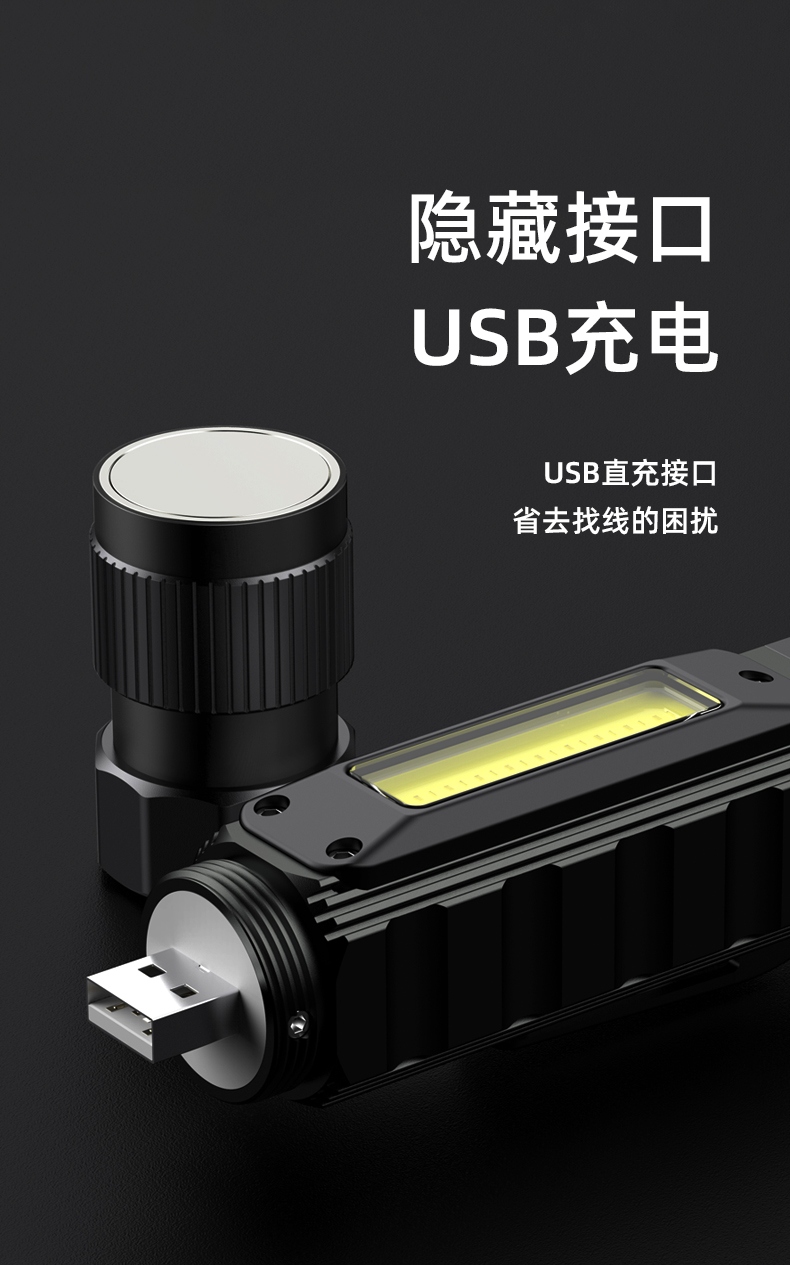 多功能旋转手电(2种光源:白/红光)头部90度旋转、可当头灯、带侧灯、腰夹,底部磁铁可根据不同场景调整照射方向。适用多种场景日常户外、工作检修、家庭应急等