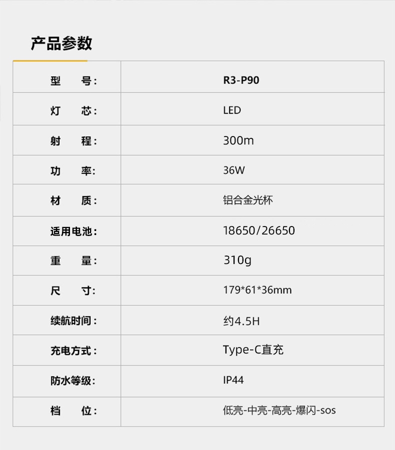 1、千米远射,射程更远,光斑更聚焦。 2、进口灯珠,亮度高,照明效果更好。 3、前后双按键,光源一键点亮,高亮瞬间开启。
