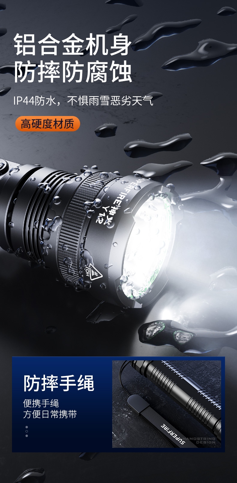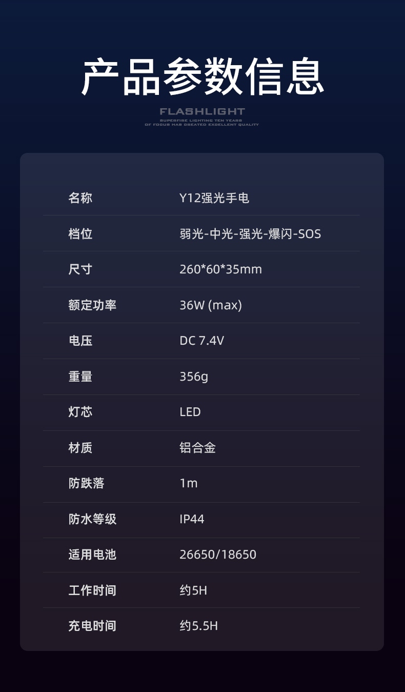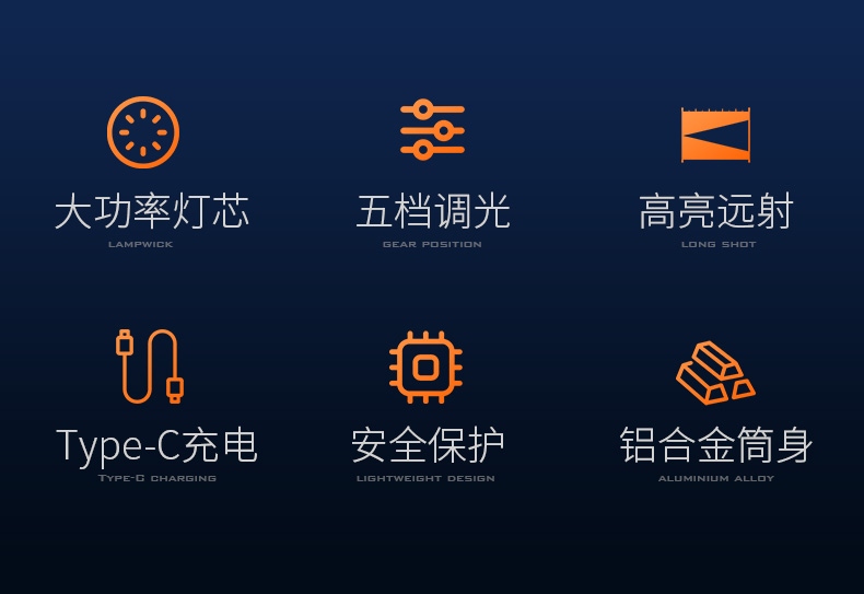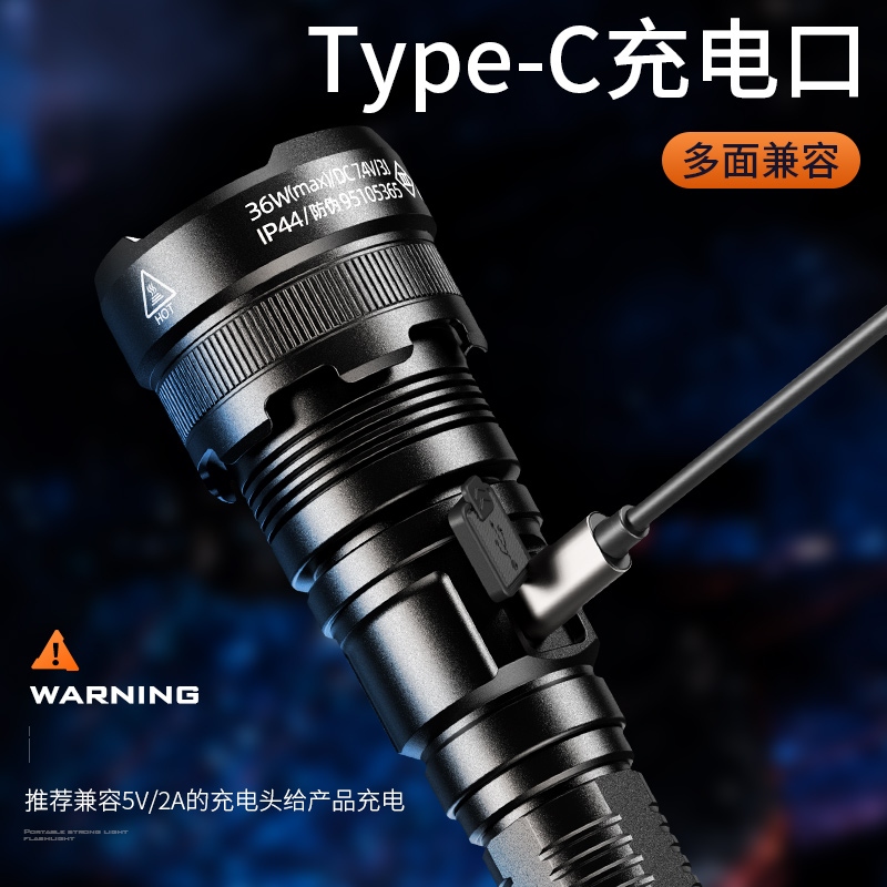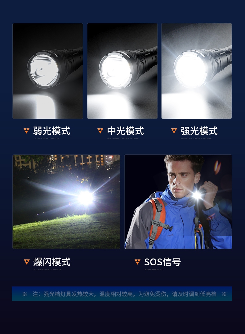 高亮远射,大功率灯芯;大容量,7000毫安充电锂电池;超长续航,高亮档可使用5.5H以上;