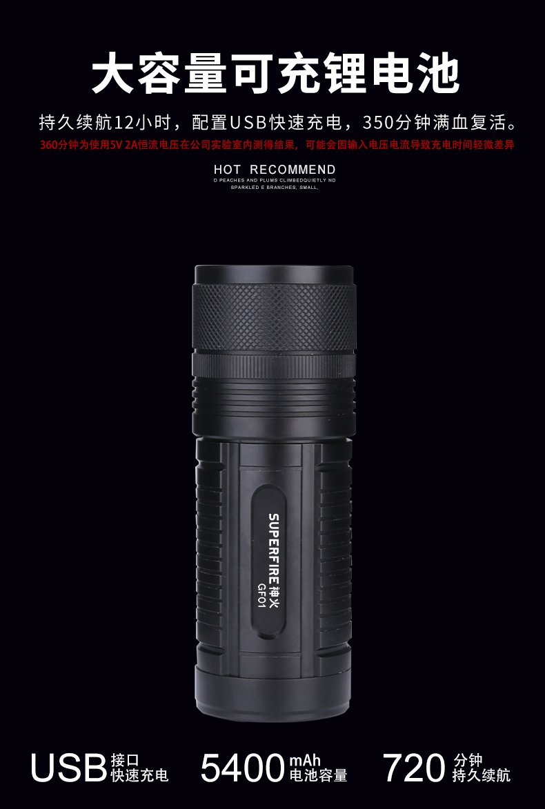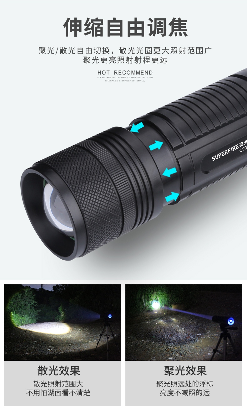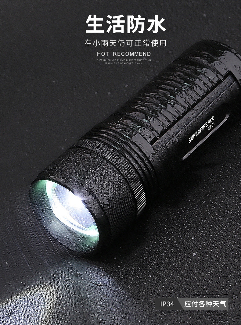 1、千米远射,射程更远,光斑更聚焦。 2、进口灯珠,亮度高,照明效果更好。 3、前后双按键,光源一键点亮,高亮瞬间开启。