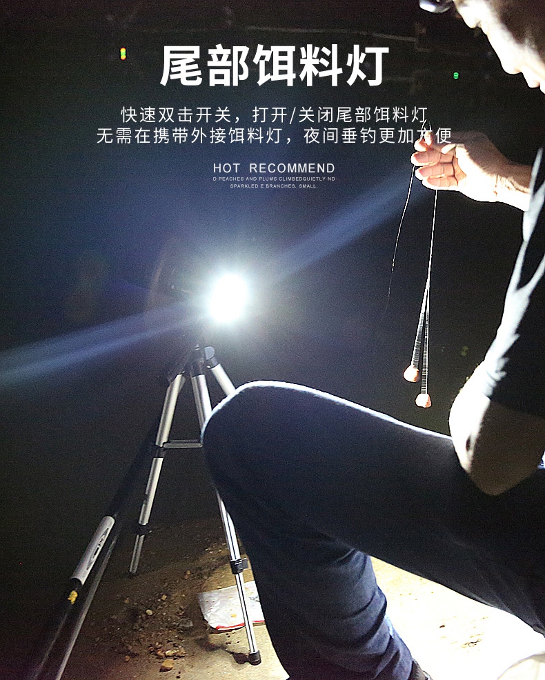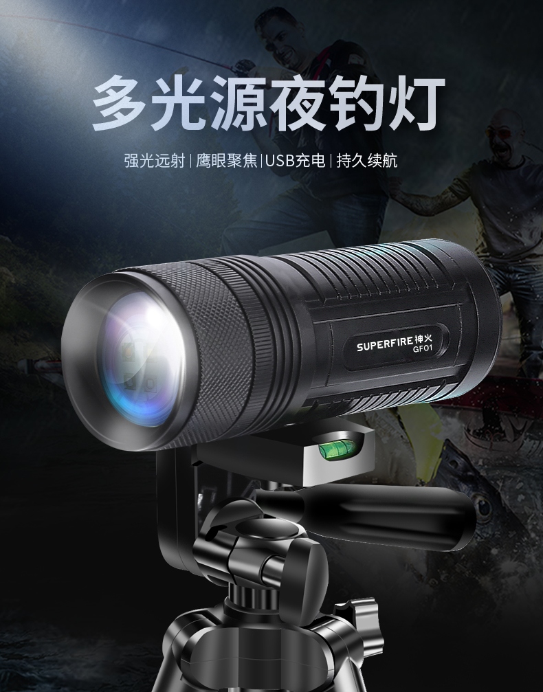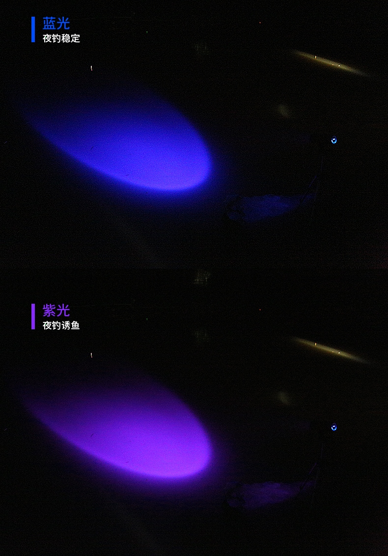 专业钓鱼灯,可调焦(4种光源:白光、黄光、蓝光、紫光),尾部带饵料灯,带电量显示,可搭配三角架使用,性价比超高。