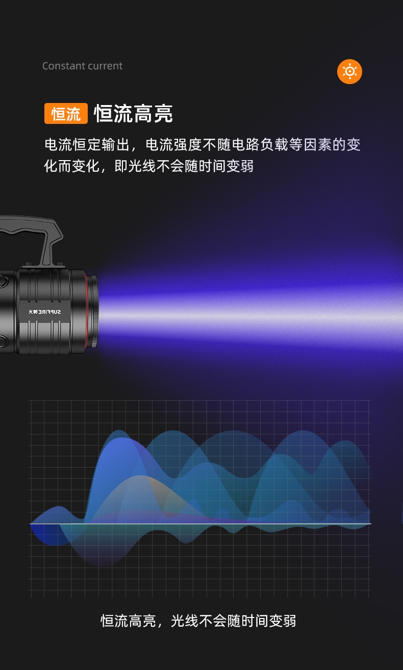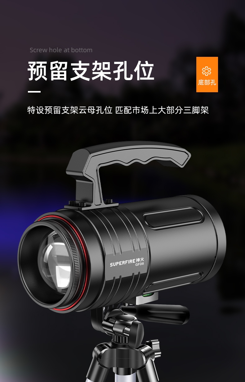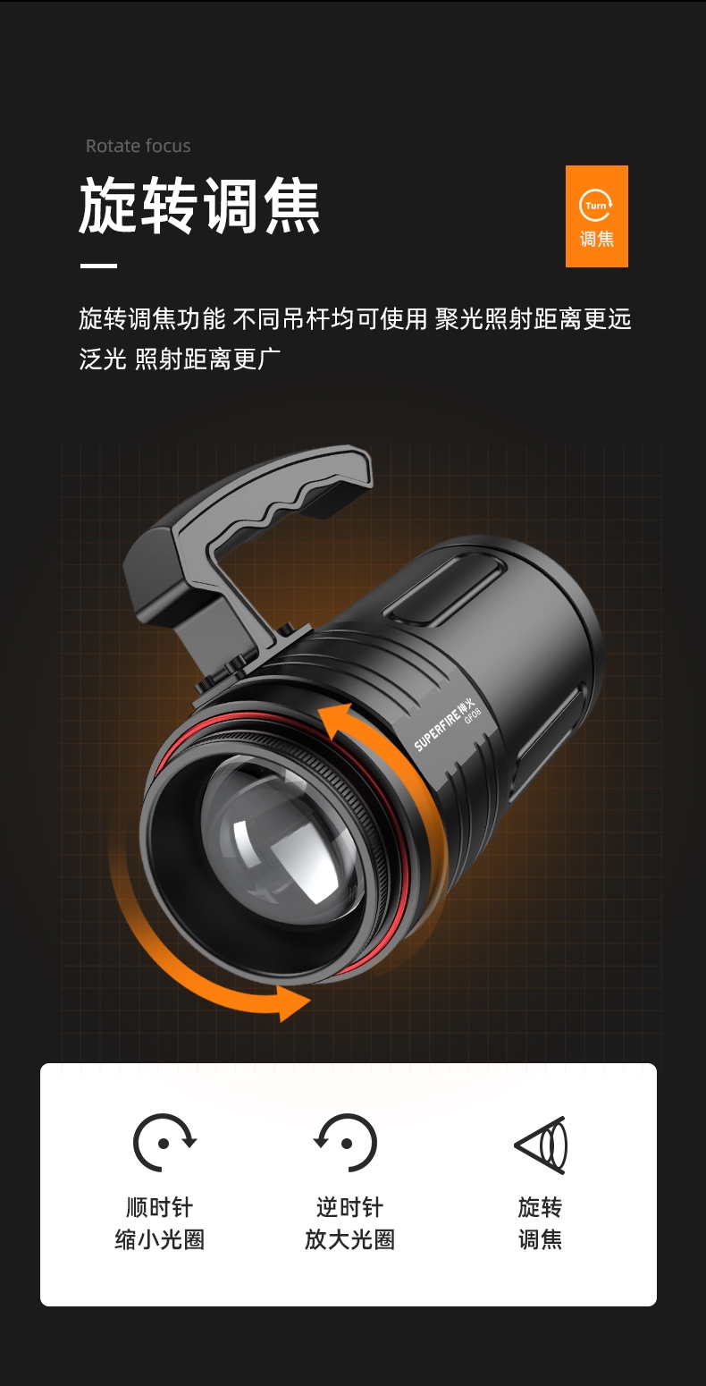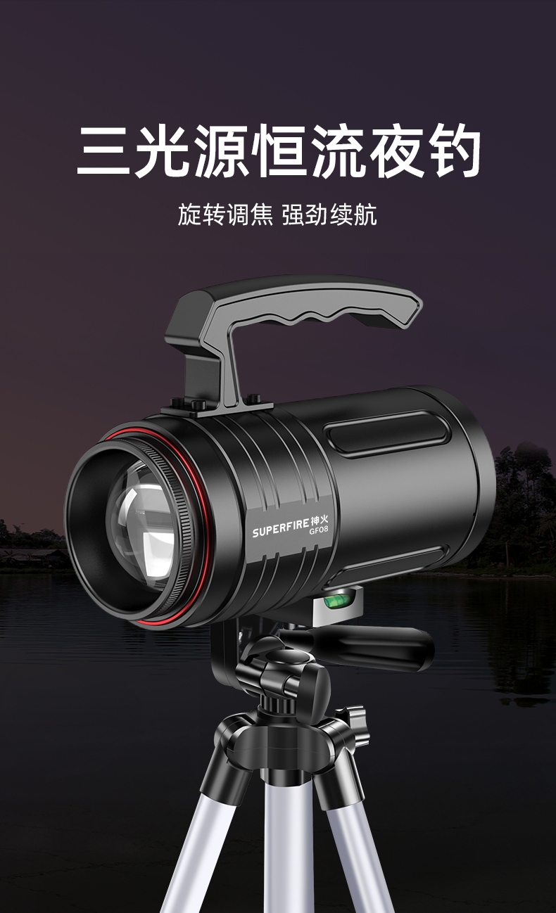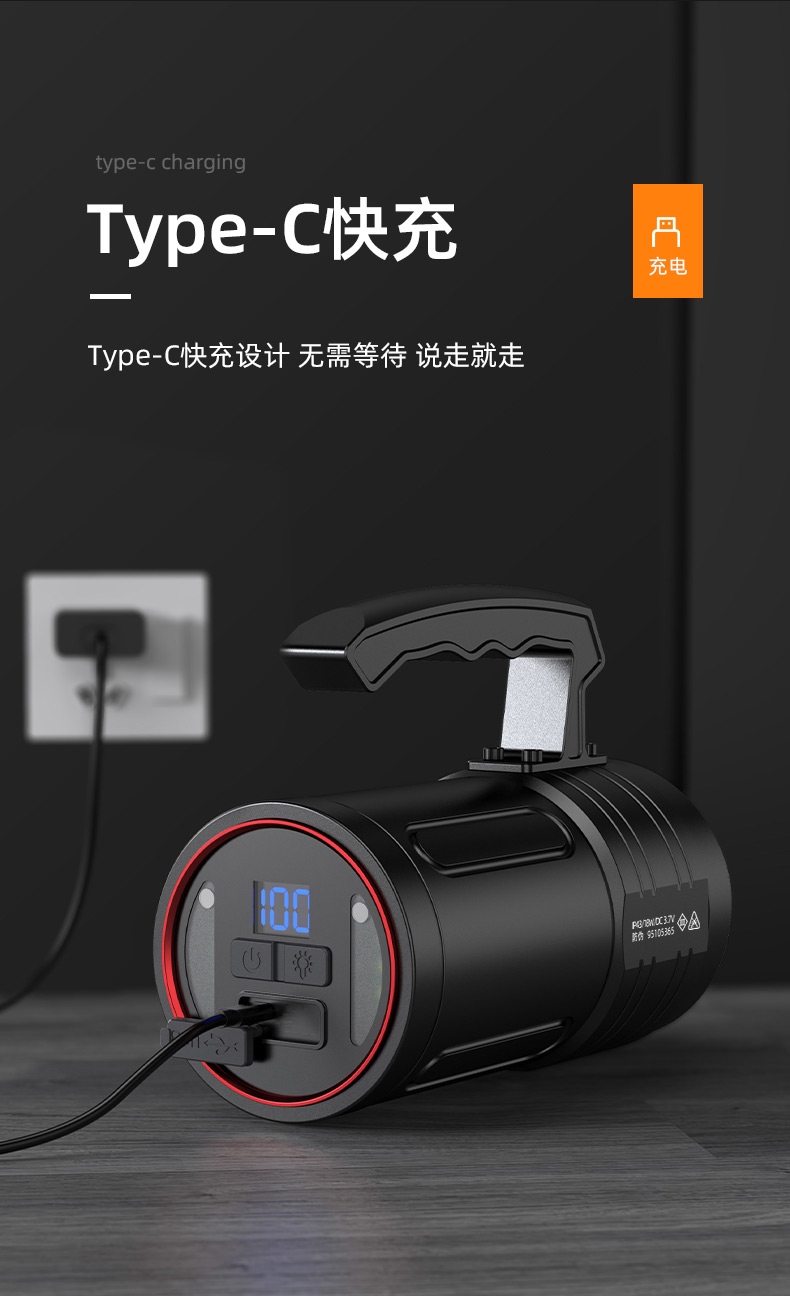1、多档调光,可满足不同使用场景下的照明需求; 2、含提手,握感更舒适。携带更简单; 3、新型高亮远射灯珠,60W大功率,亮度高,照明效果好。