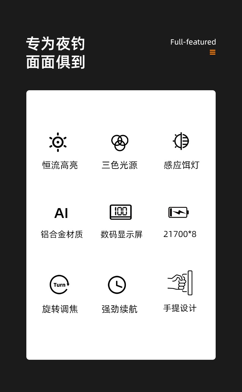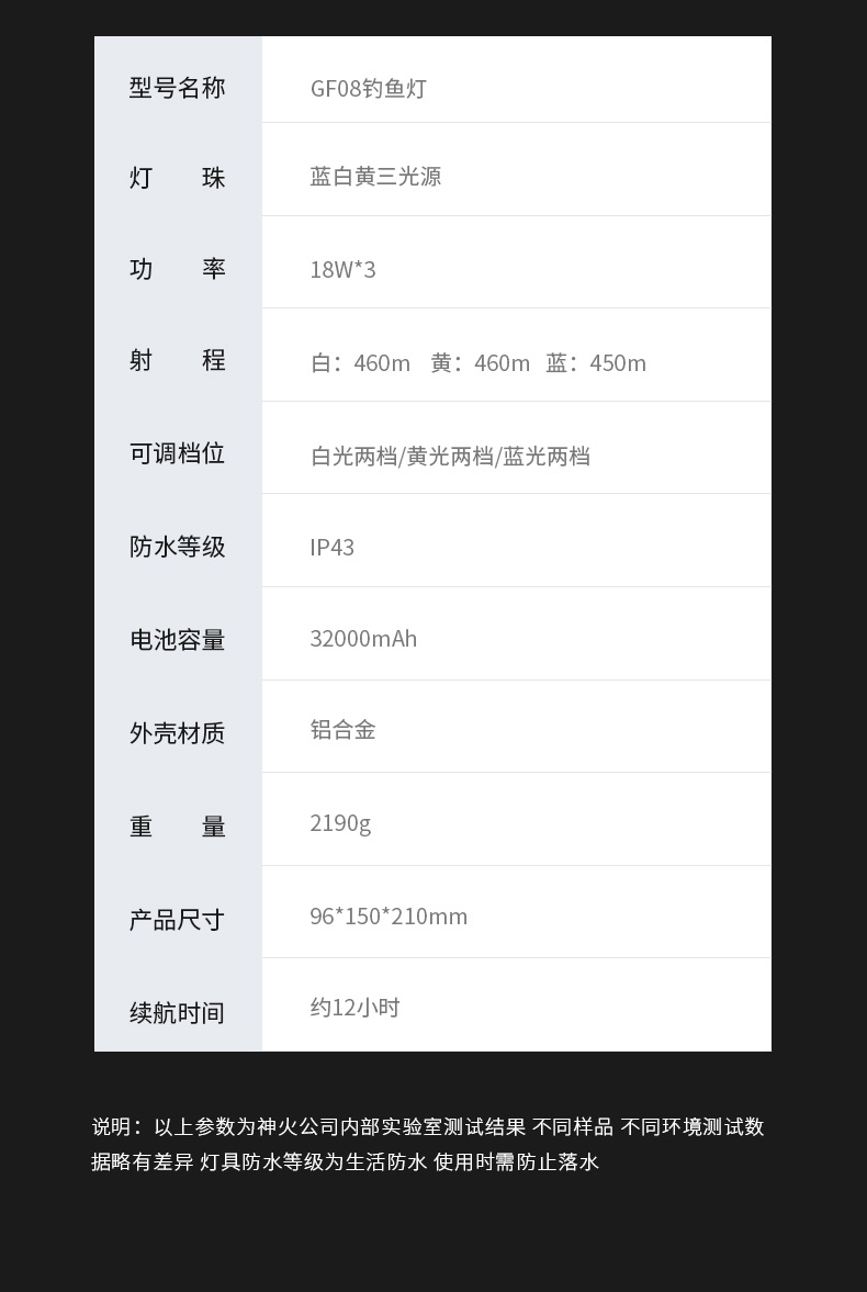 专业钓鱼灯(3种光源:白光、黄光、蓝光),数显电量提示更直观