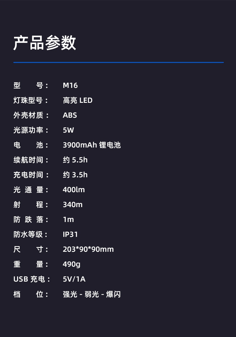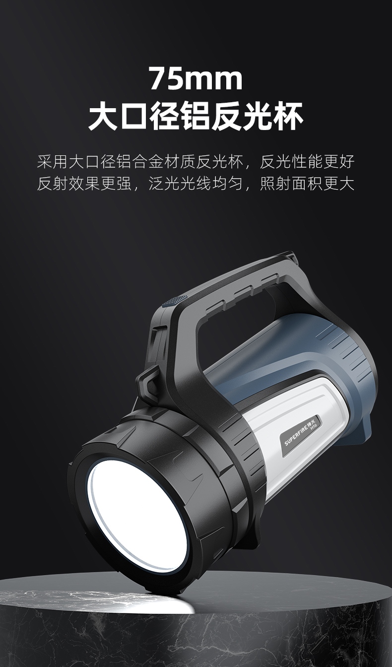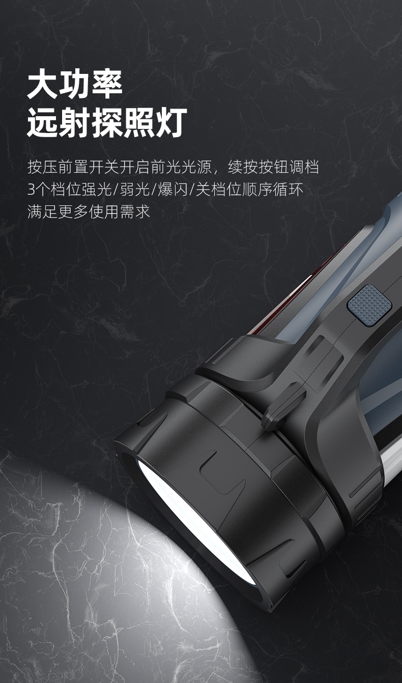 1、多档调光,可满足不同使用场景下的照明需求; 2、含提手,握感更舒适。携带更简单; 3、新型高亮远射灯珠,60W大功率,亮度高,照明效果好。
