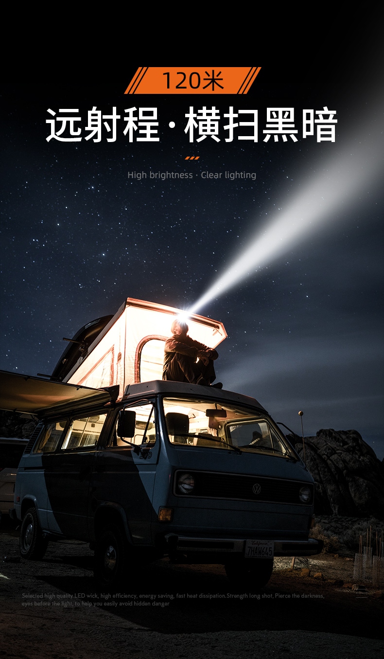 1、千米远射,射程更远,光斑更聚焦。 2、进口灯珠,亮度高,照明效果更好。 3、前后双按键,光源一键点亮,高亮瞬间开启。