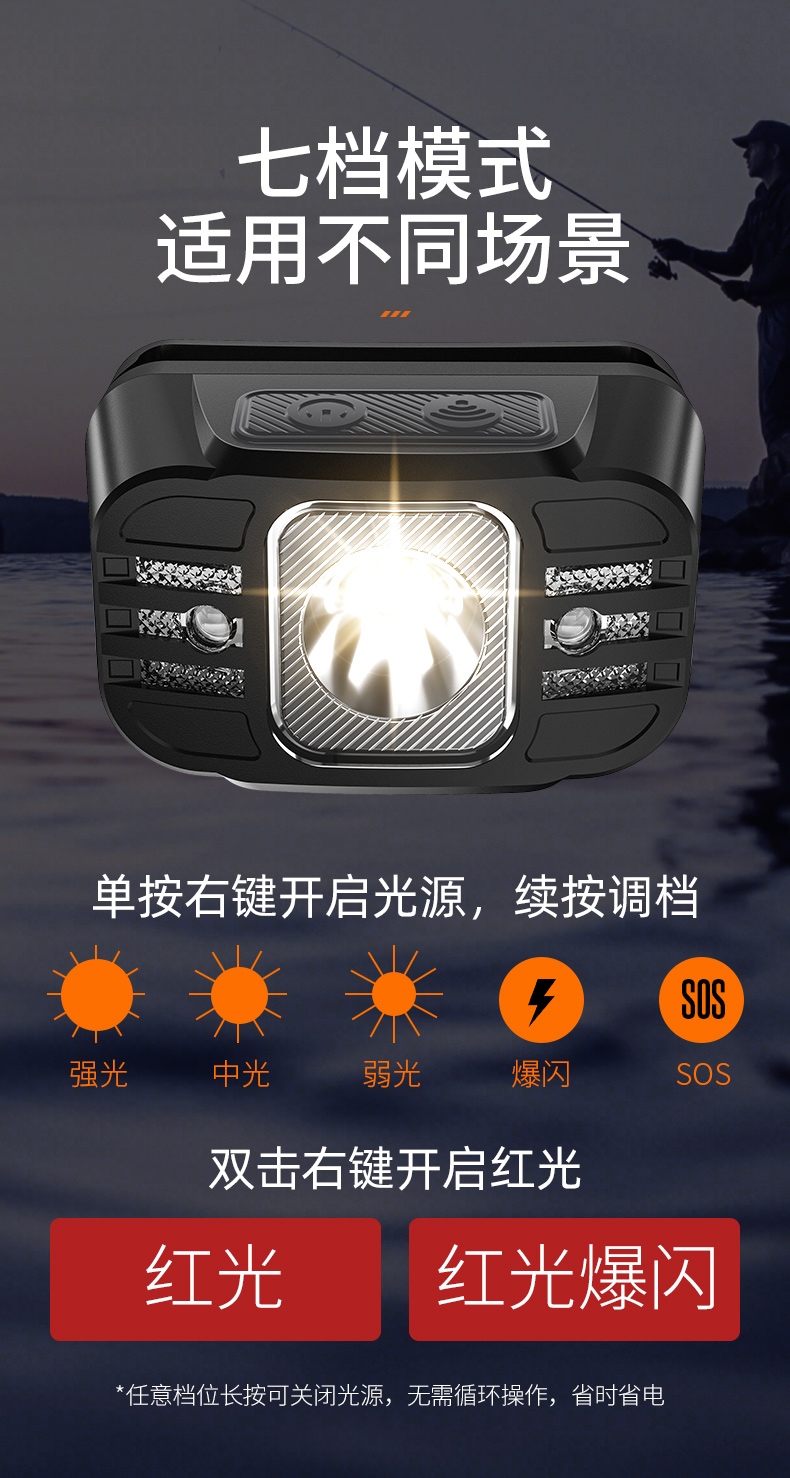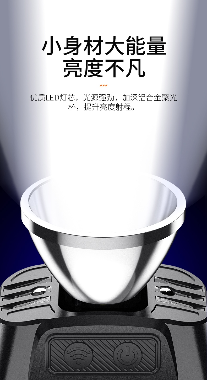 强光亮度,运动头灯,前后均衡设计,轻便不压头,可调节式头灯带,佩戴方便舒适,伸缩调焦,光照范围大,照射距离远,头灯角度调节,超90度角度随意调节,适宜各种环境使用