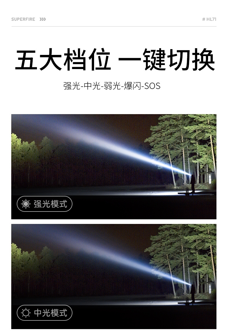 1、五档一体:强光--中光-弱光-爆闪-SOS-关