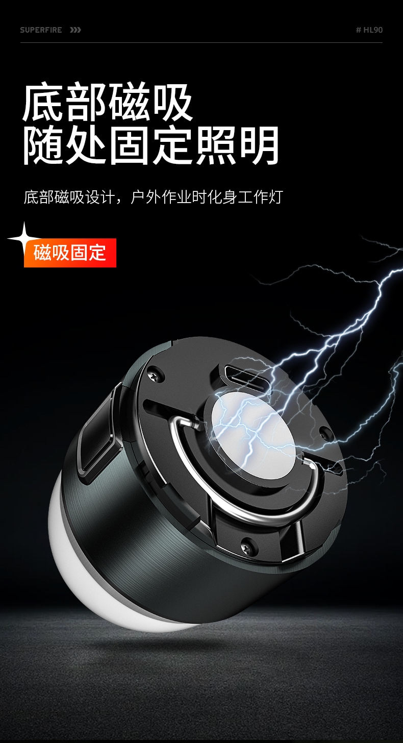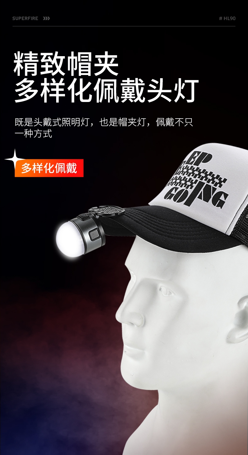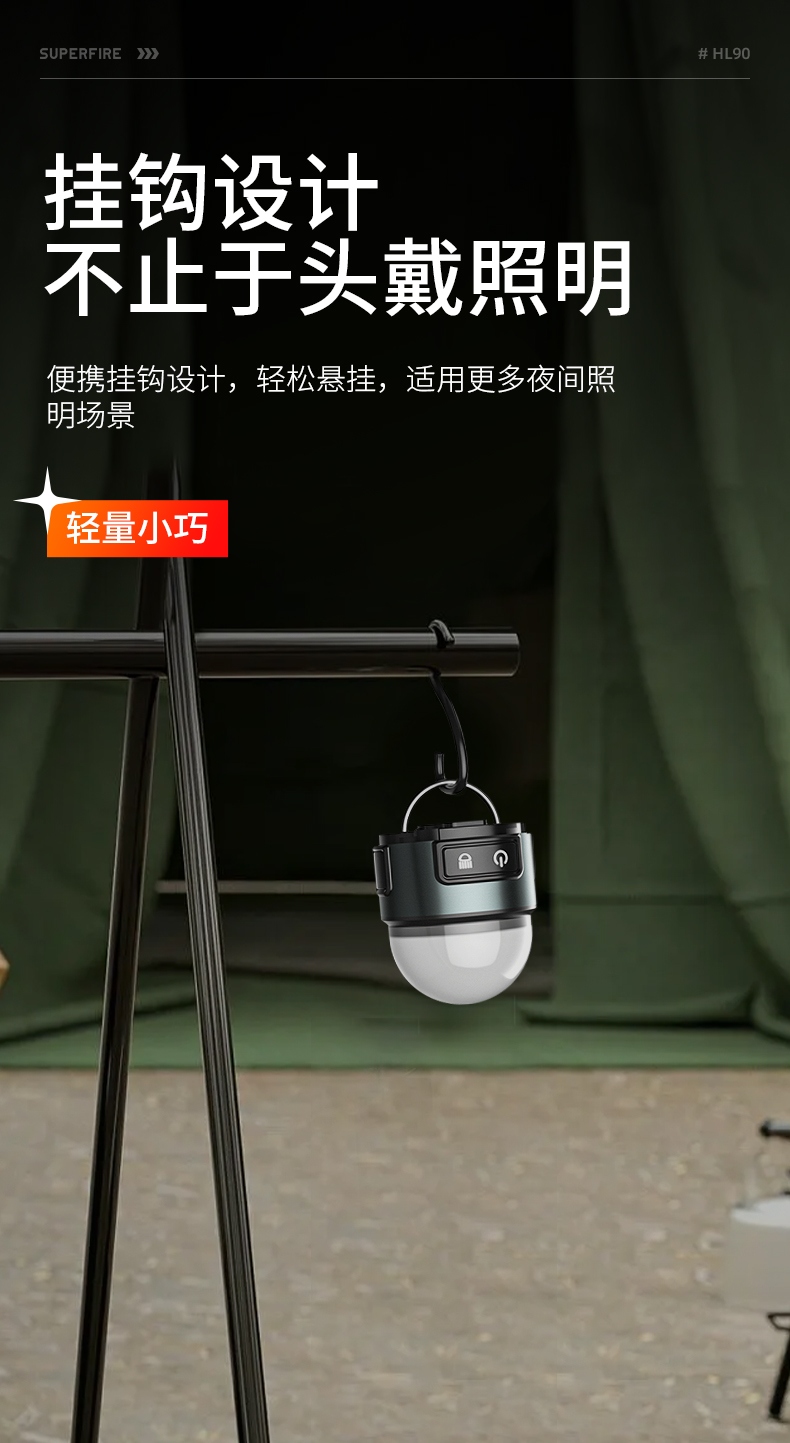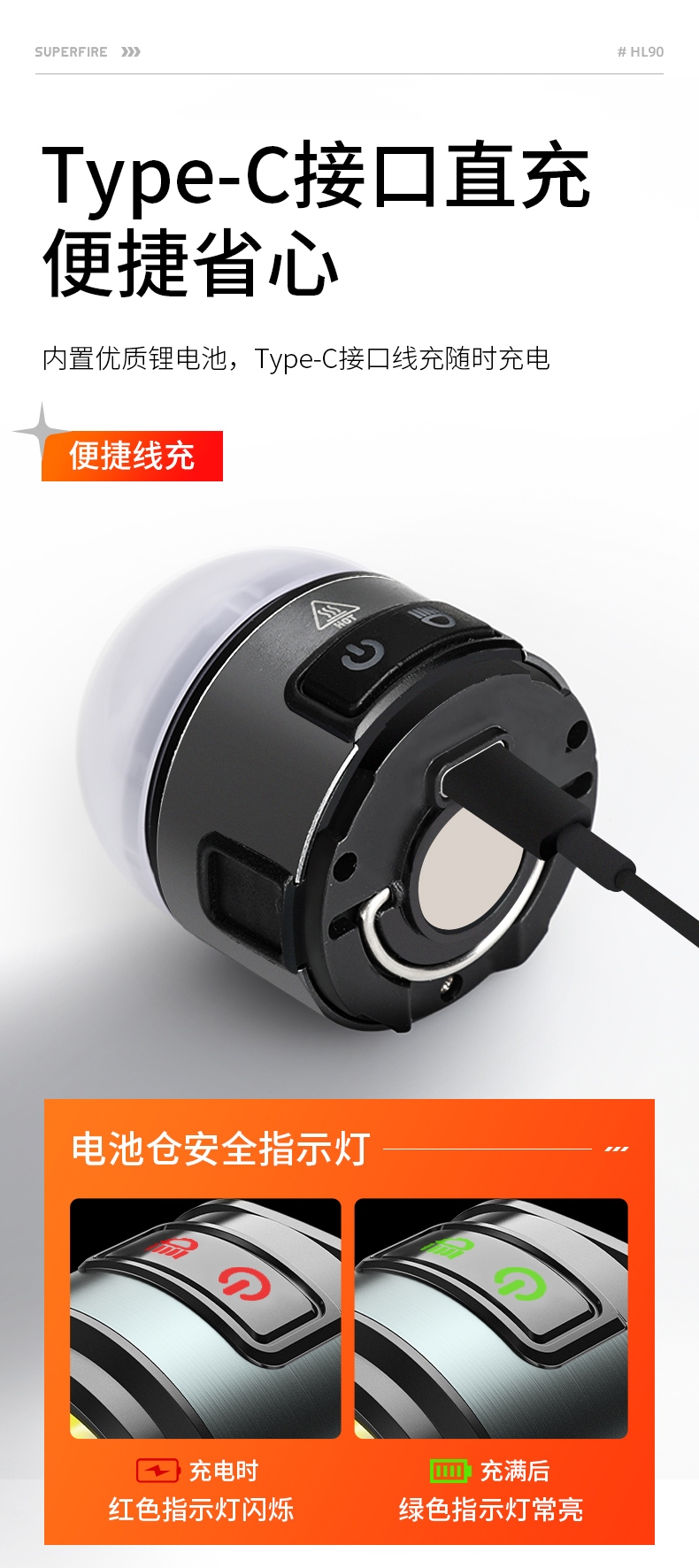 1.充电时红色指示灯常亮,充满时绿色指示灯常亮。 2.旋转拆卸头灯后盖, 可使用配套Type-c线进行充电。 3.拆卸头灯后盖,可使用磁吸及挂钩功能,秒变工作灯;搭配灯罩可变为迷你野营灯;头灯后盖含帽夹功能,可改为帽夹灯使用。