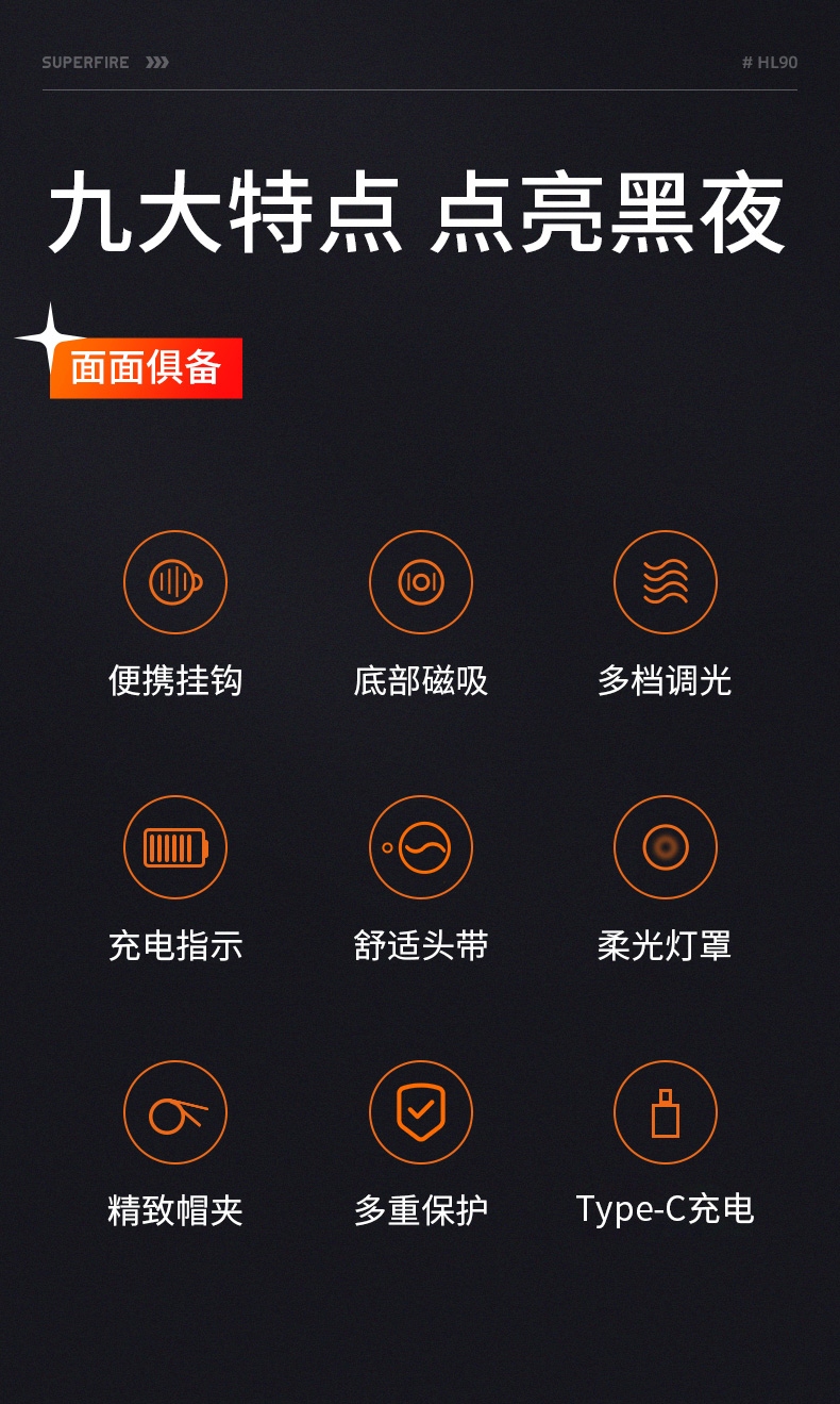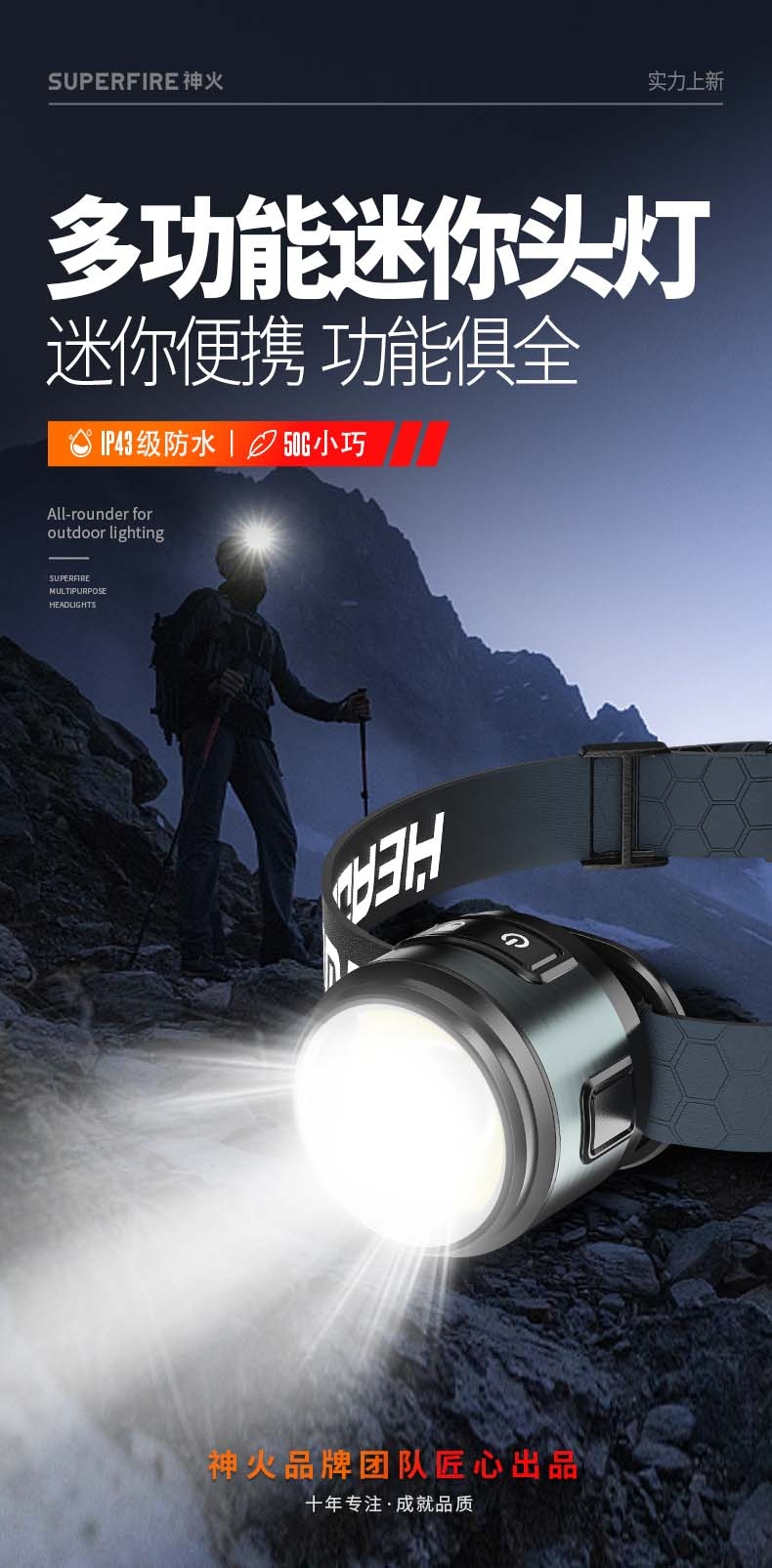强光亮度,运动头灯,前后均衡设计,轻便不压头,可调节式头灯带,佩戴方便舒适,伸缩调焦,光照范围大,照射距离远,头灯角度调节,超90度角度随意调节,适宜各种环境使用