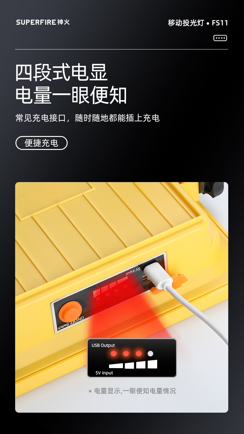 1.单击左边开关开启感应功能,同时开启强光档,续按关闭感应功能(关闭感应功能,光源不会关闭),当感应功能开启时,单击右边开关可正常调节档位。 2.多样化充电,使用方便:设有Type-c充电口,可使用充电器、充电宝、电脑等设备为灯具充电。 3.电量显示:实时