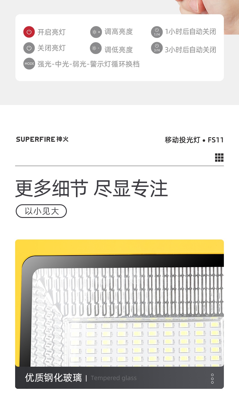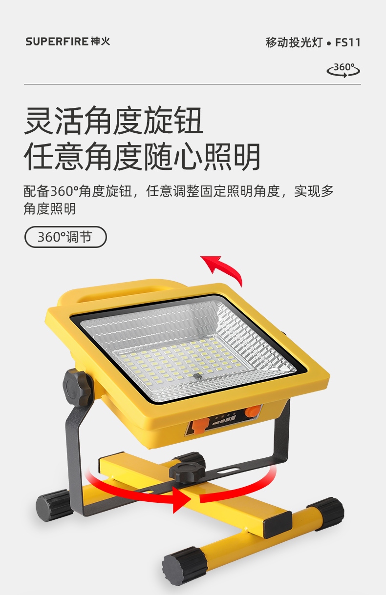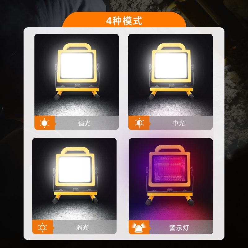 1、多档调光,可满足不同使用场景下的照明需求; 2、含提手,握感更舒适。携带更简单; 3、新型高亮远射灯珠,60W大功率,亮度高,照明效果好。