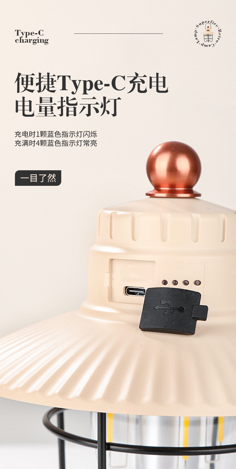 1.充电时1颗蓝色指示灯闪烁;充满时4颗蓝色指示灯常亮。 2.配有小TYPE-C输入接口,充电方便。充电时可边充电边使用照明功能。