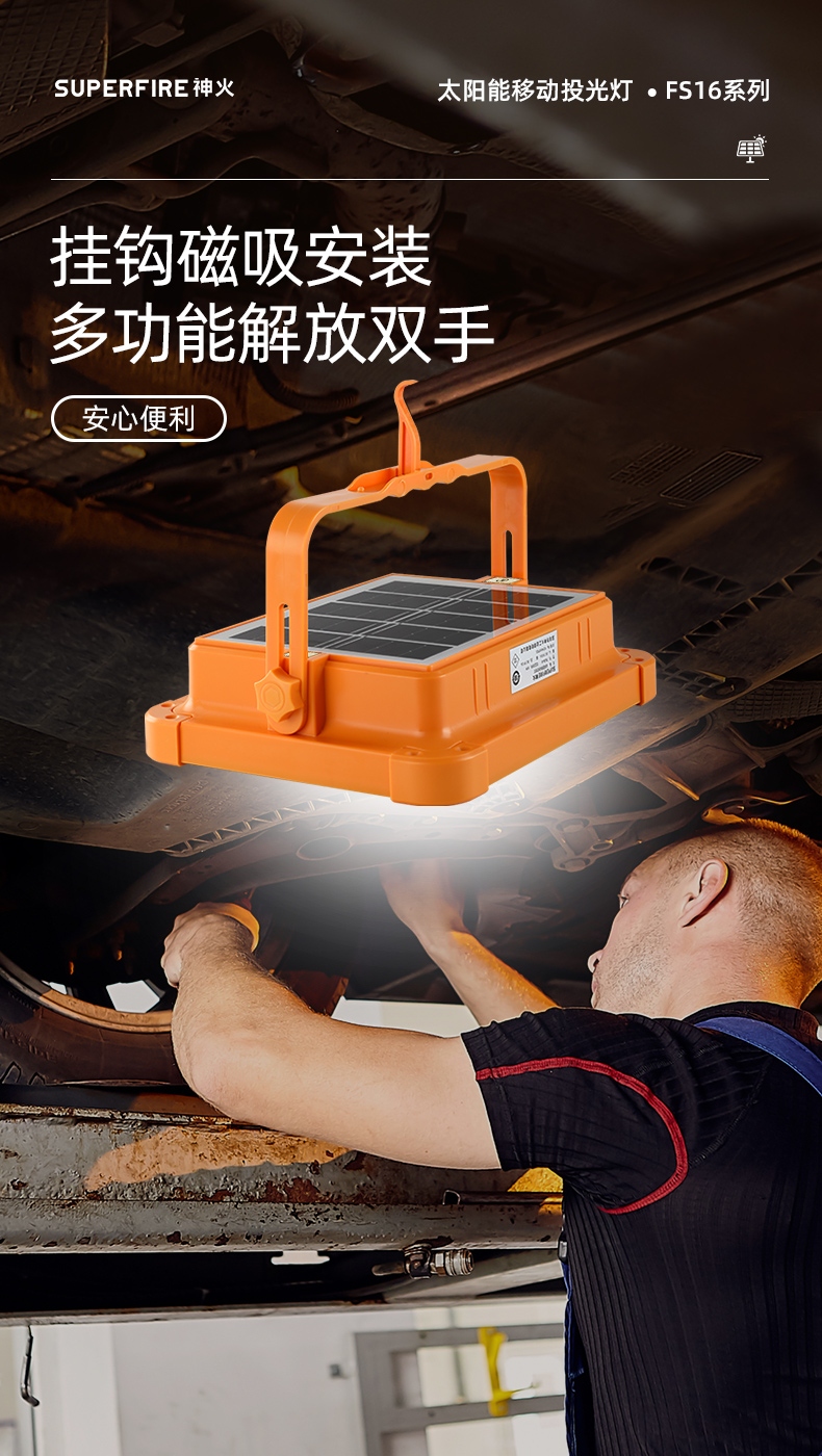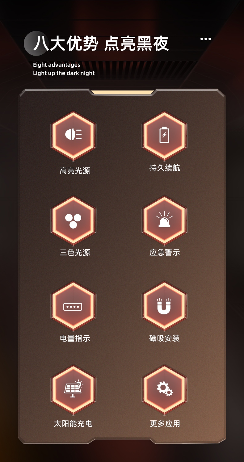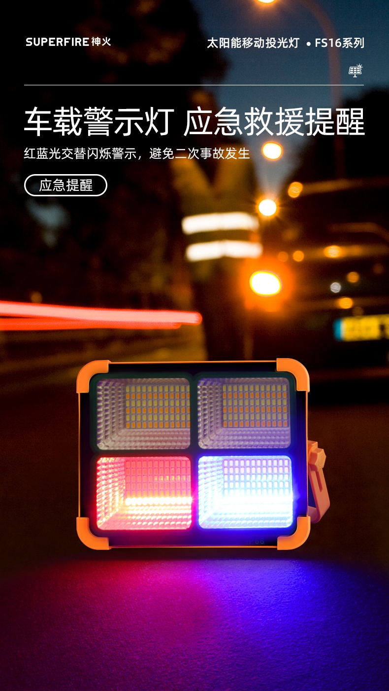 高亮光源 持久续航 三色光源 应急警示 电量指示 磁吸安装 太阳能充电