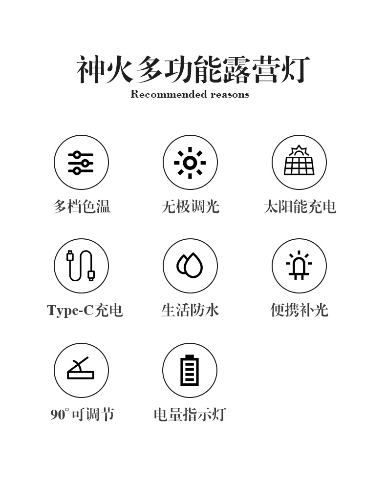 1、.照明角度90°可调节。2.带有云螺母,可做补光灯使用3.带有太阳能电池板,可应急充电