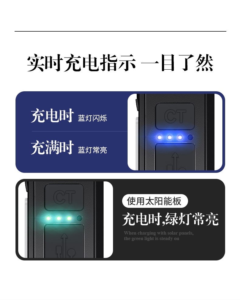 2.使用配套充电线给产品充电时,1颗蓝色指示灯闪烁,依次常亮,充满时4颗蓝色指示灯常亮。使用太阳能电池板给产品充电时,一颗绿色指示