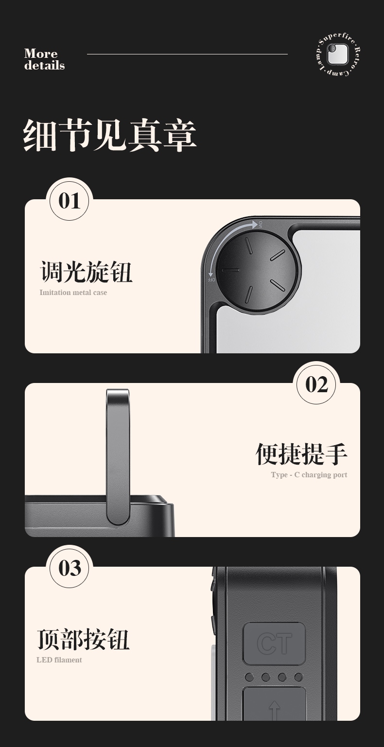 1、六档调光,可满足不同使用场景下的照明需求。 2、进口高亮朗明纳斯灯珠,照明效果更好。 3、含档位记忆,任意档位快捷关机 ,开机恢复关机前档位。