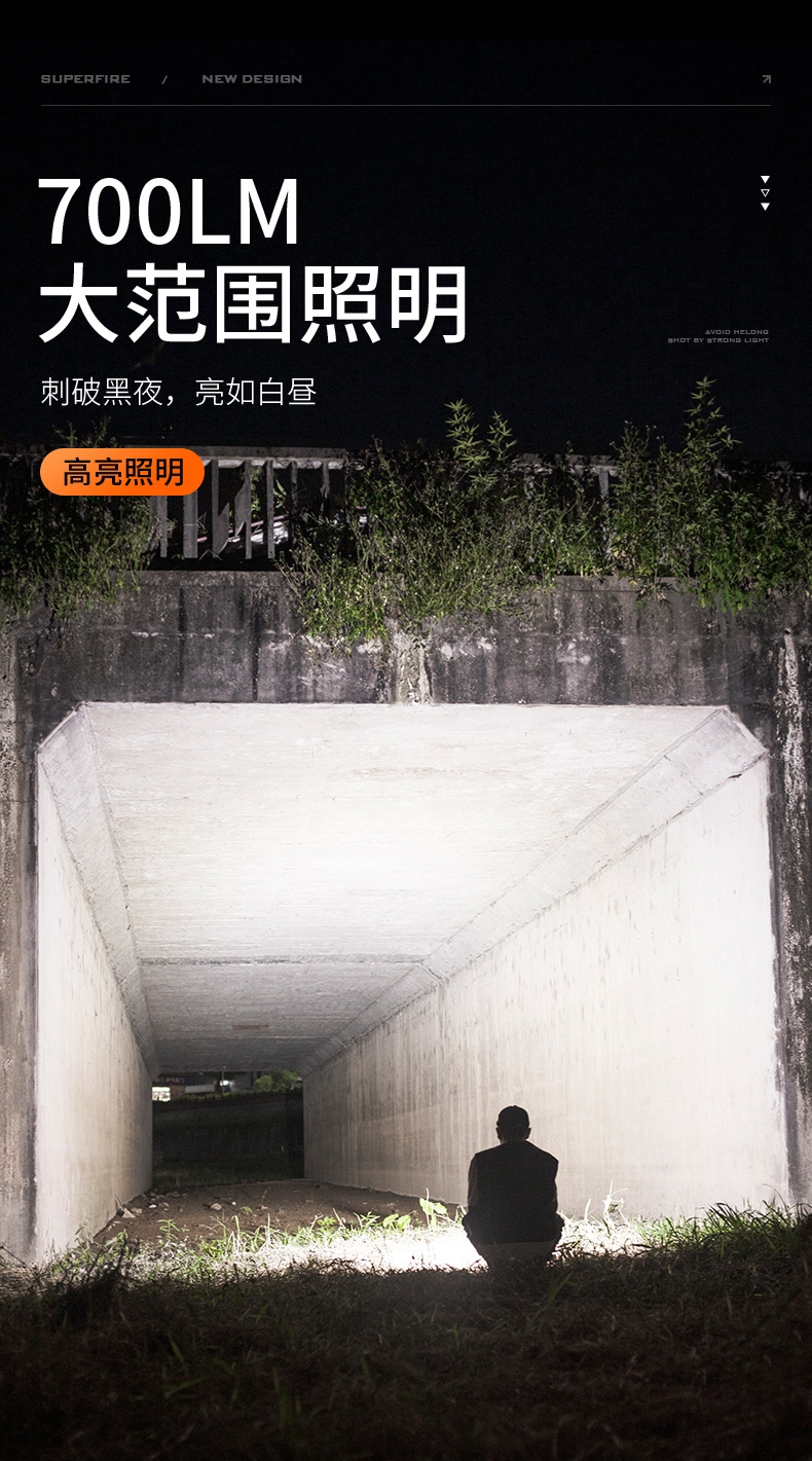 6、最高700Lm亮度,最远220m 射程,小身材大能量。