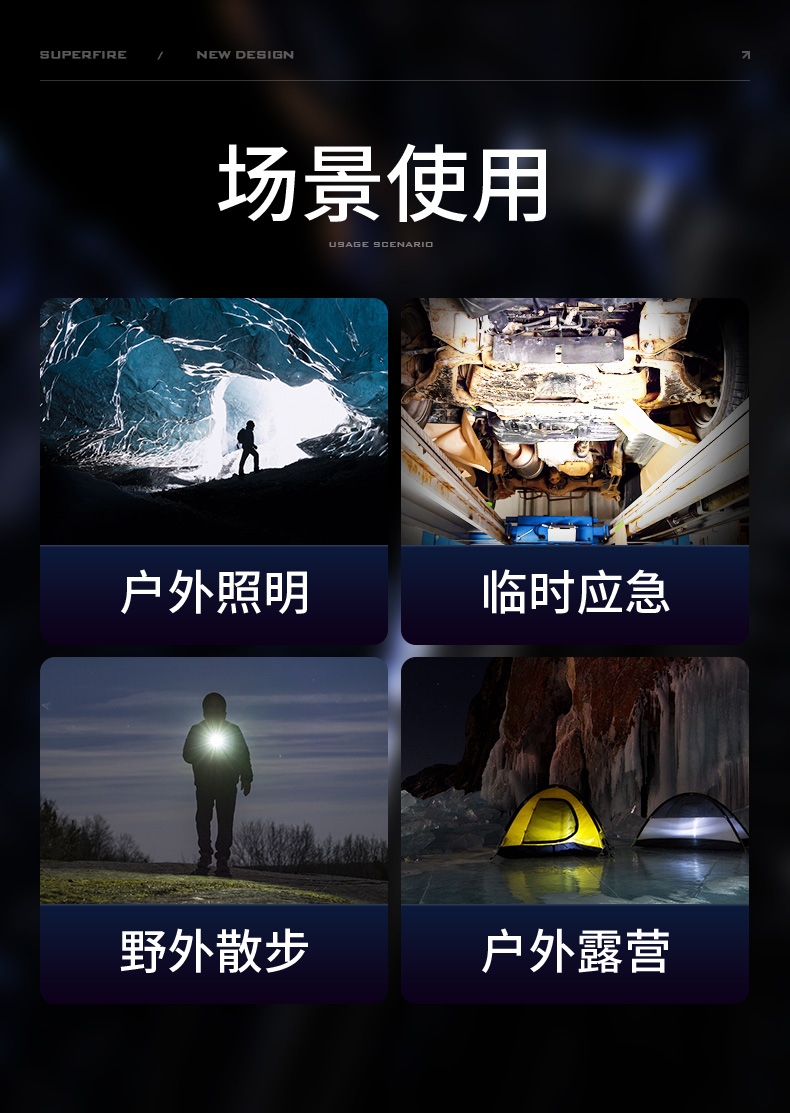 1、多档调光、可满足不同场景下的使用需求。 2、伸缩调焦、聚泛随心。