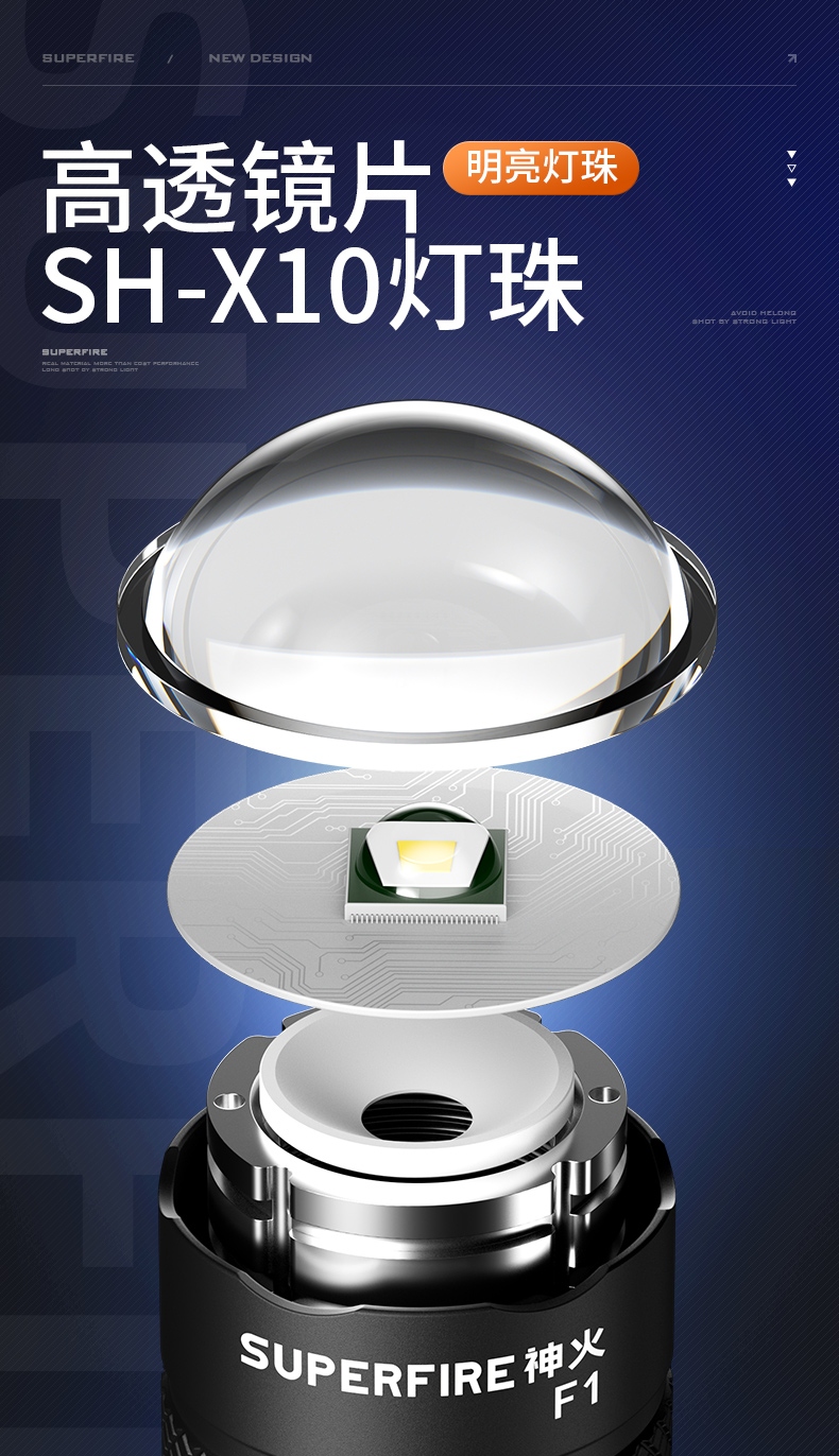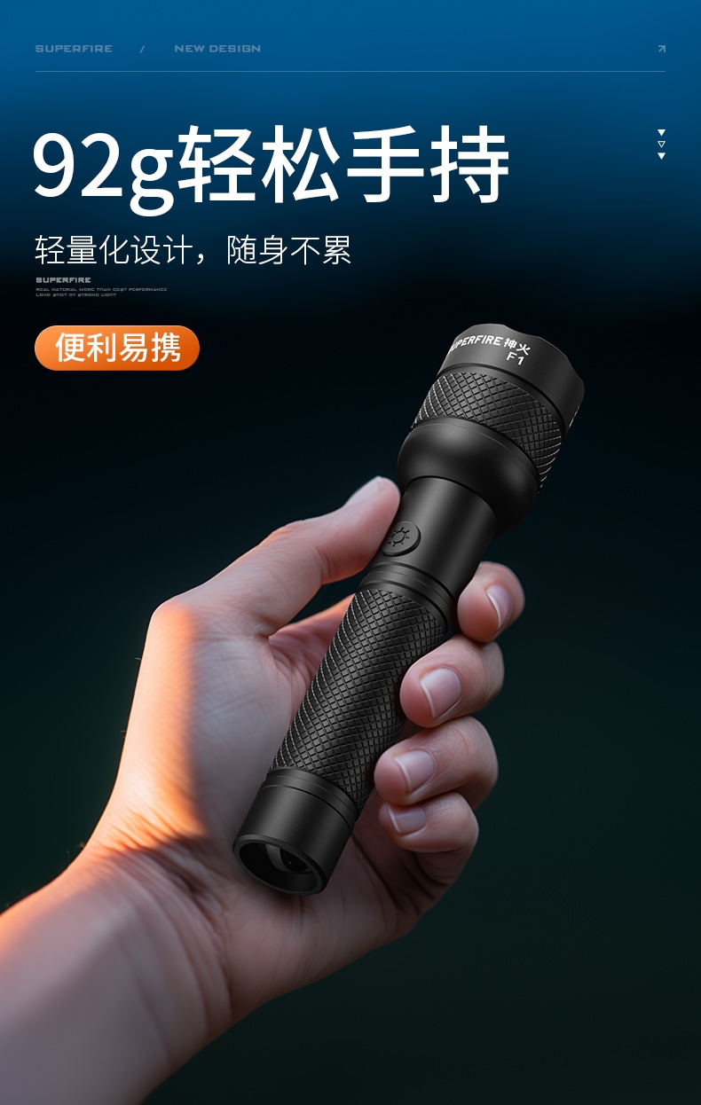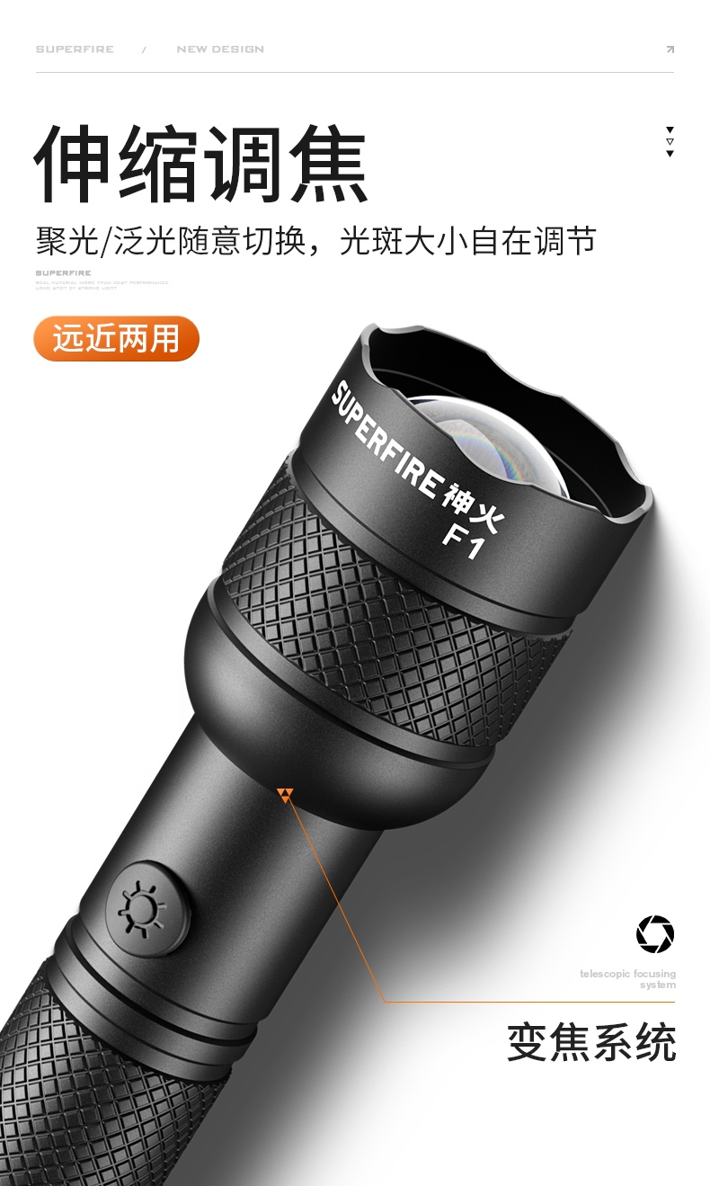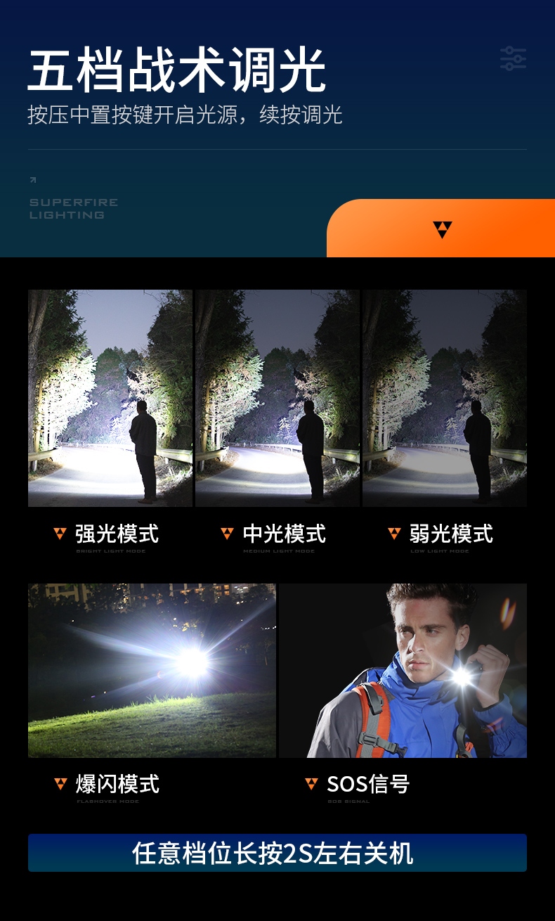 1、千米远射,射程更远,光斑更聚焦。 2、进口灯珠,亮度高,照明效果更好。 3、前后双按键,光源一键点亮,高亮瞬间开启。