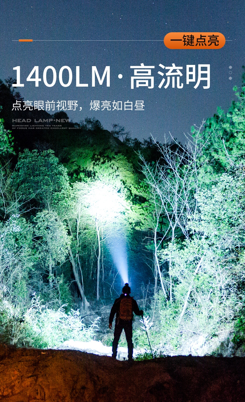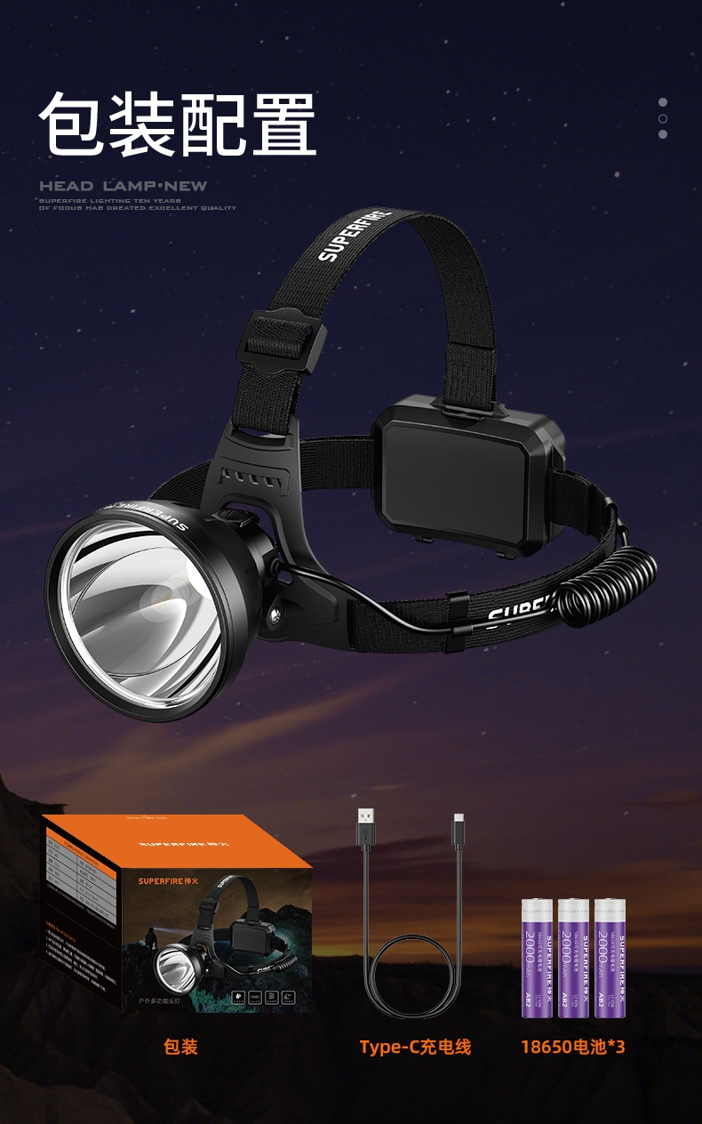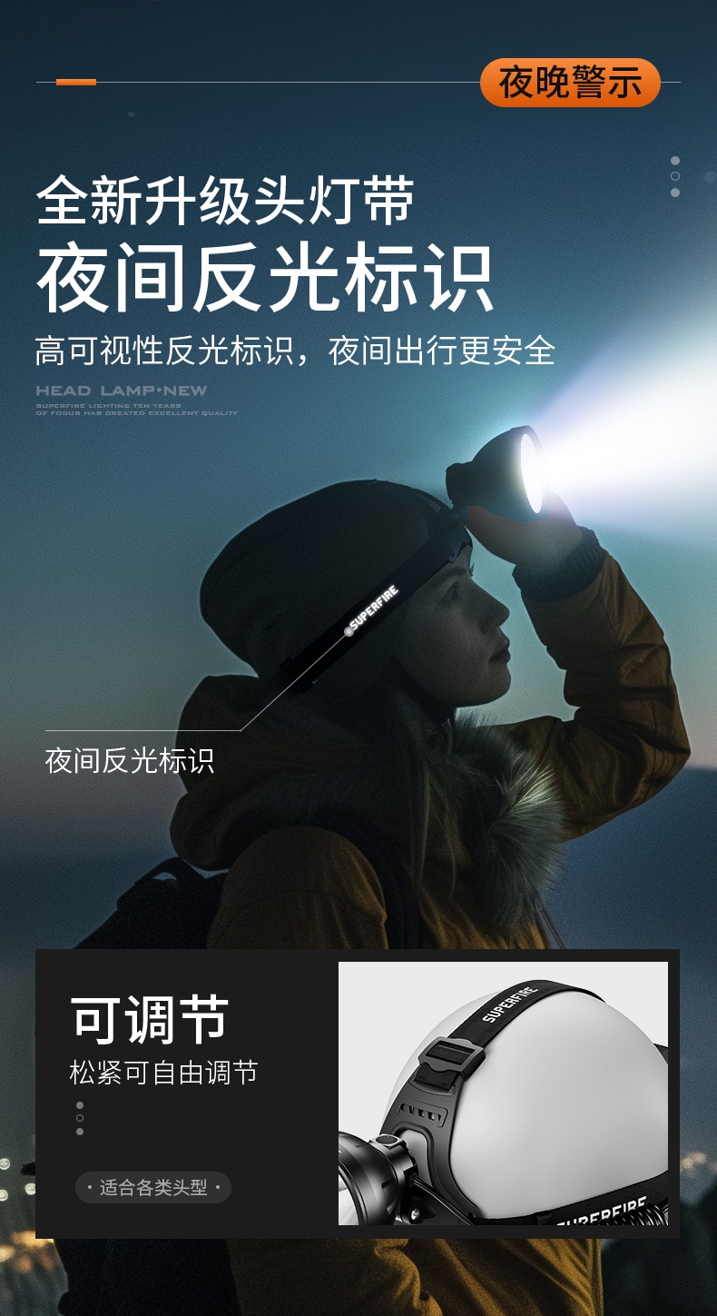 强光亮度,运动头灯,前后均衡设计,轻便不压头,可调节式头灯带,佩戴方便舒适,伸缩调焦,光照范围大,照射距离远,头灯角度调节,超90度角度随意调节,适宜各种环境使用