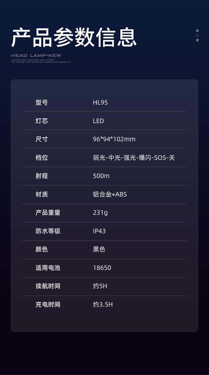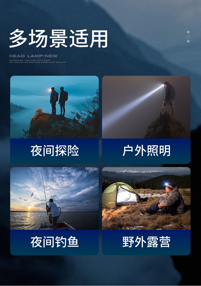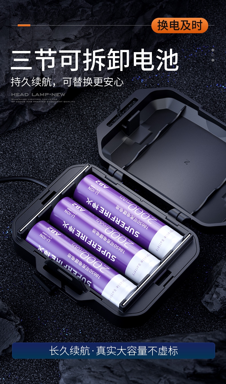 强光亮度,运动头灯,前后均衡设计,轻便不压头,可调节式头灯带,佩戴方便舒适,伸缩调焦,光照范围大,照射距离远,头灯角度调节,超90度角度随意调节,适宜各种环境使用