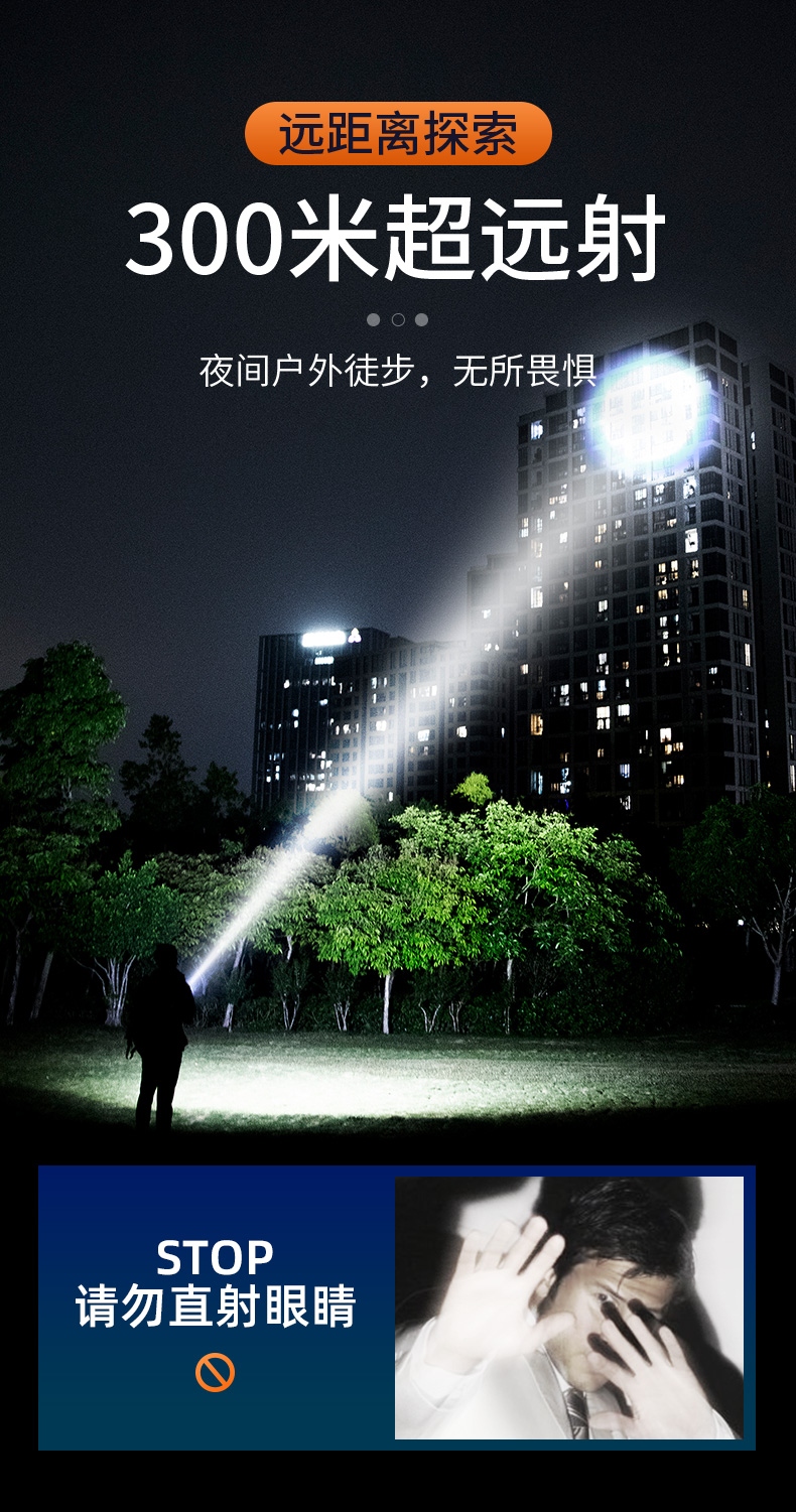 1、千米远射,射程更远,光斑更聚焦。 2、进口灯珠,亮度高,照明效果更好。 3、前后双按键,光源一键点亮,高亮瞬间开启。