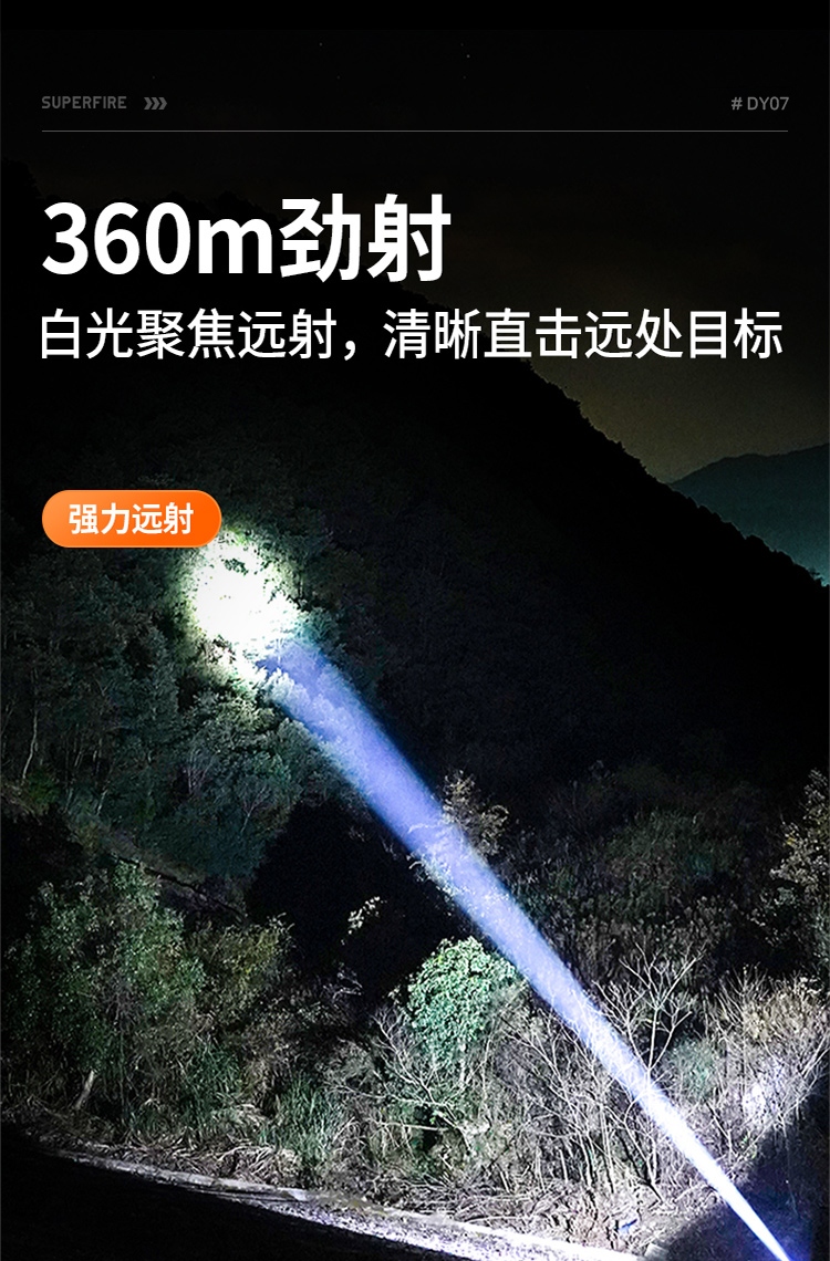 1、千米远射,射程更远,光斑更聚焦。 2、进口灯珠,亮度高,照明效果更好。 3、前后双按键,光源一键点亮,高亮瞬间开启。