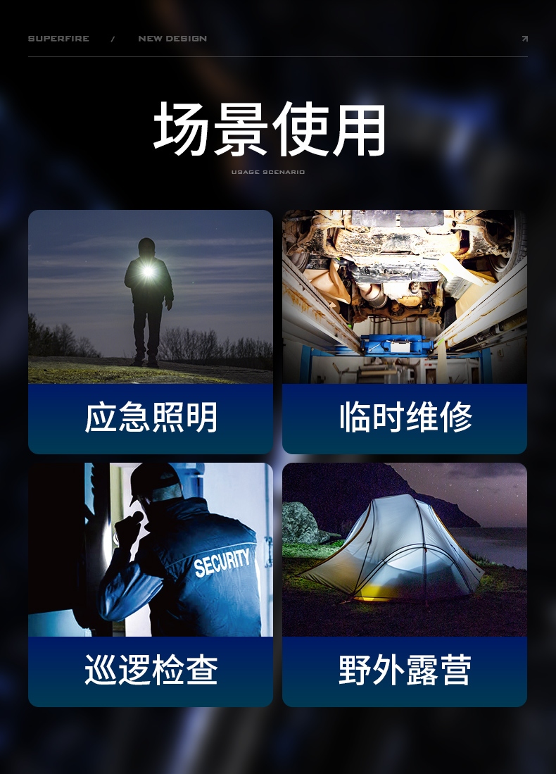 聚光主灯 亮度随心 轻按后端开关按钮,主灯强光点亮,续按依次切换主灯工作光-爆闪光。主灯开启状态下长按5秒,可实现光源色温转换。主灯关闭状态下长按5秒,可开启灯具最亮照明模式。 爆亮强光 亮如白昼 1500LM大功率高亮光源,点亮顷刻如白昼