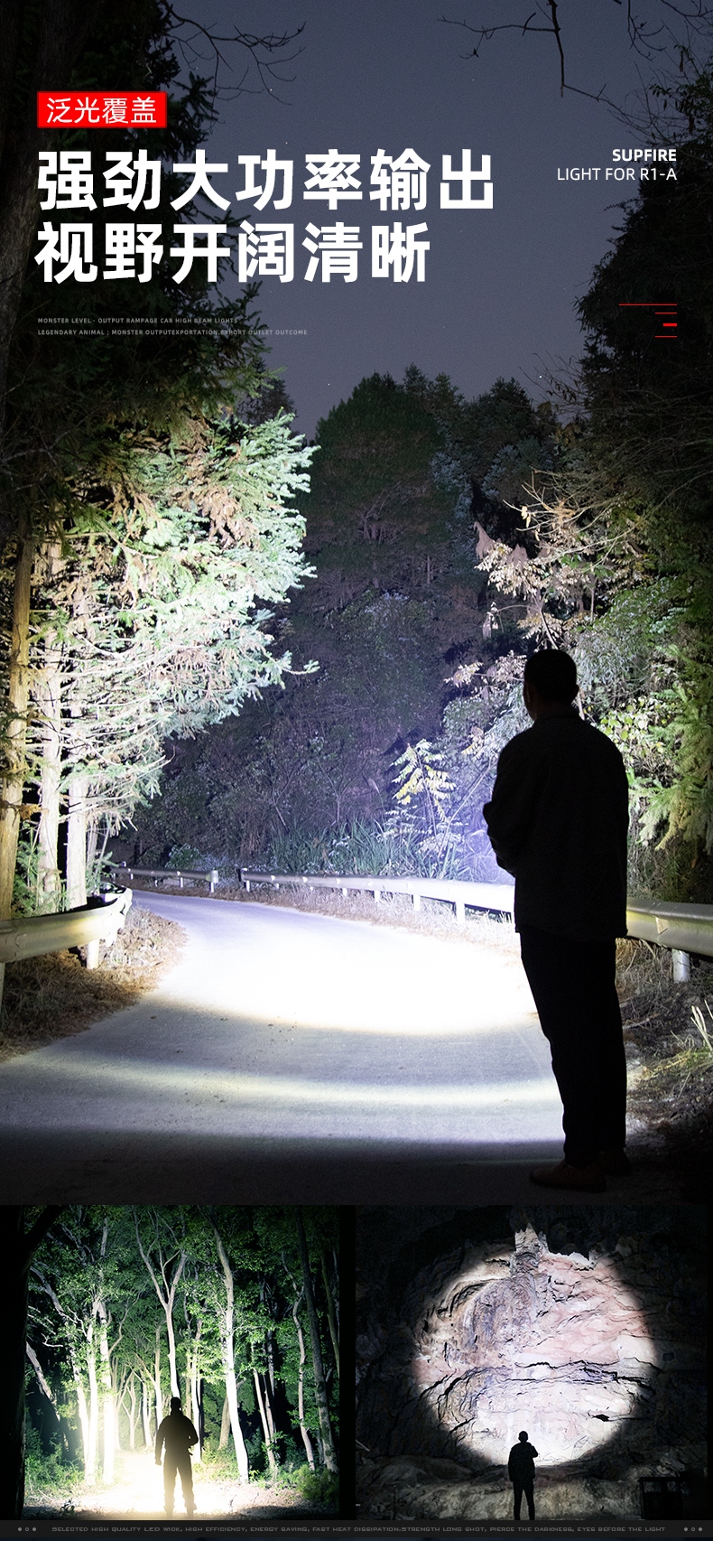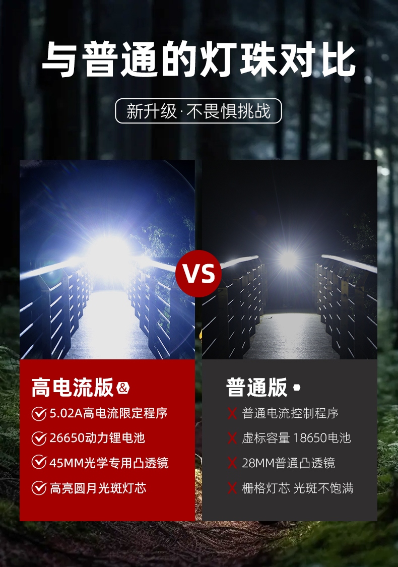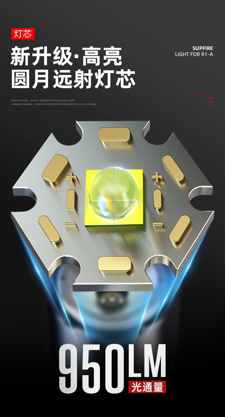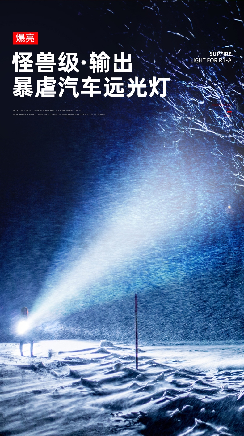 1、大尺寸铝合金光杯,光斑更圆润。 2、新型高亮远射灯珠,40W大功率,亮度高,照明效果好。