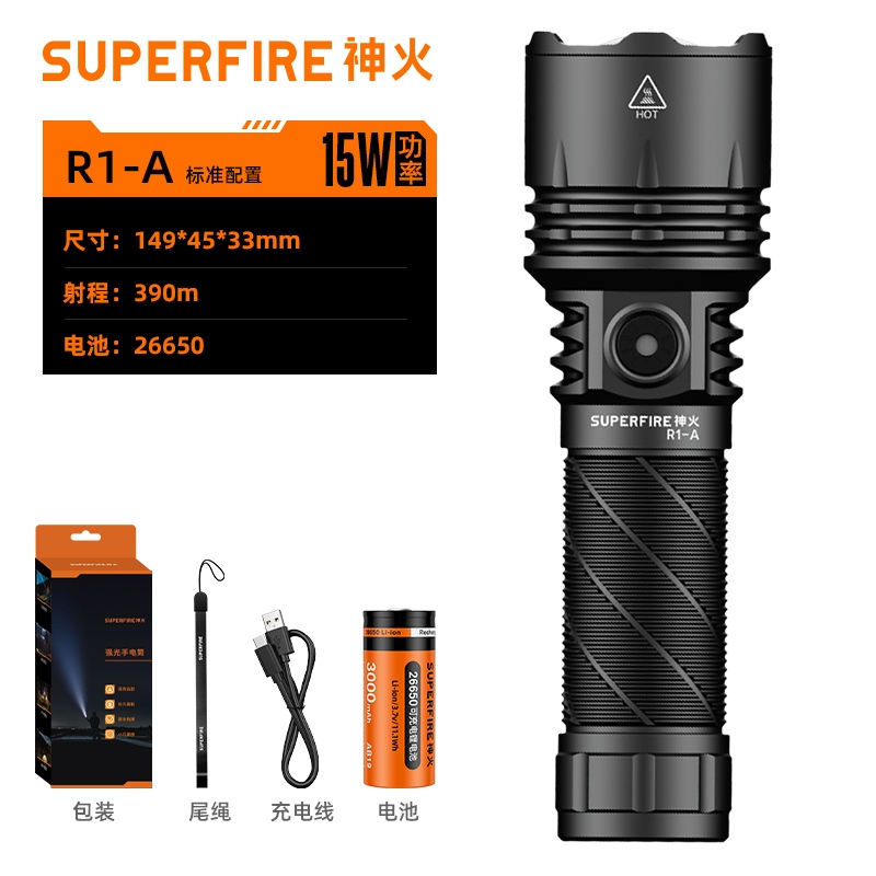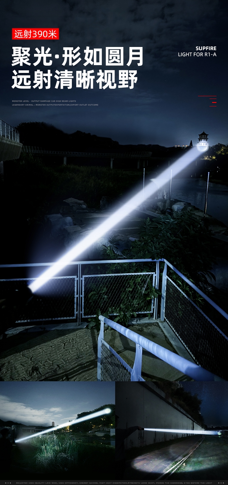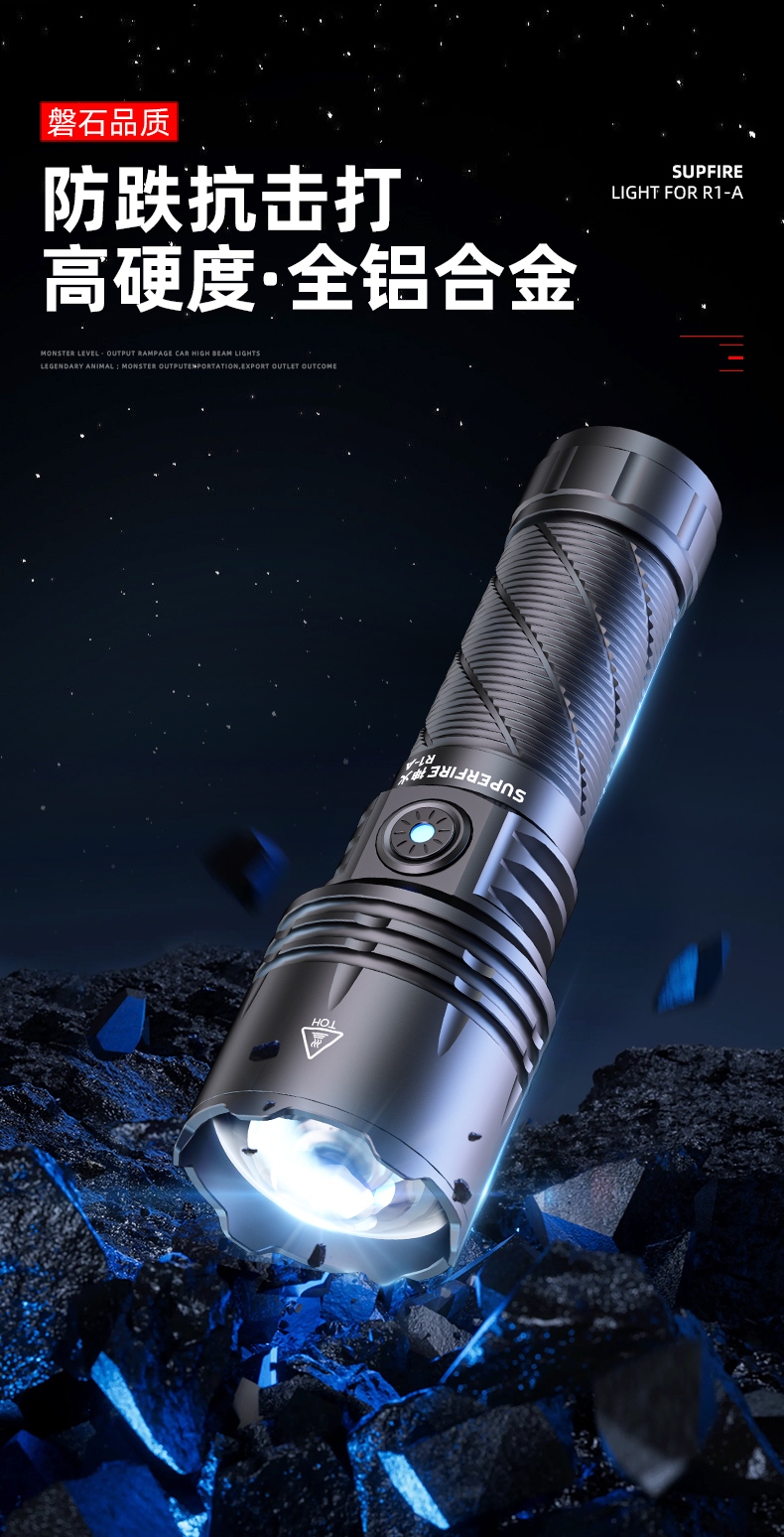 1、千米远射,射程更远,光斑更聚焦。 2、进口灯珠,亮度高,照明效果更好。 3、前后双按键,光源一键点亮,高亮瞬间开启。