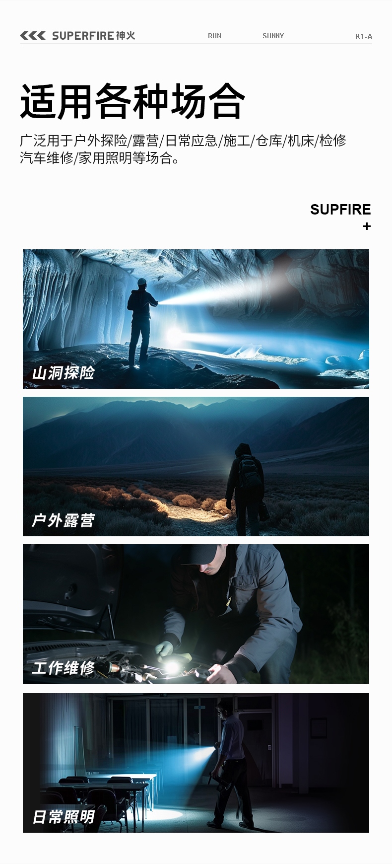 聚光主灯 亮度随心 轻按后端开关按钮,主灯强光点亮,续按依次切换主灯工作光-爆闪光。主灯开启状态下长按5秒,可实现光源色温转换。主灯关闭状态下长按5秒,可开启灯具最亮照明模式。 爆亮强光 亮如白昼 1500LM大功率高亮光源,点亮顷刻如白昼