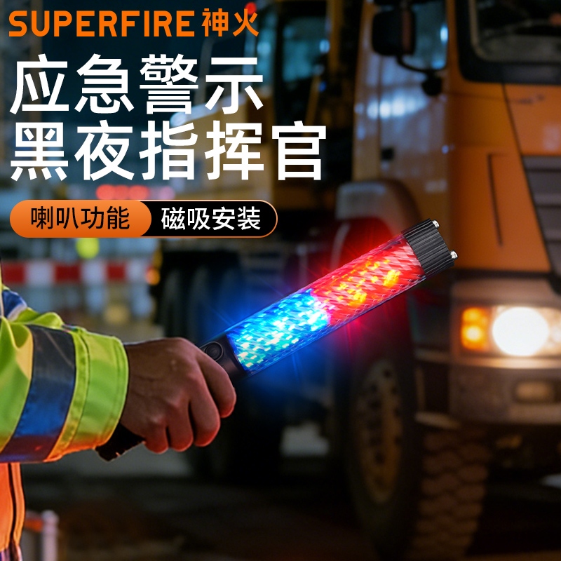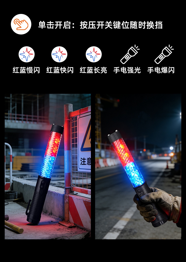 2,按压灯光键,挡位依次:红蓝慢闪-红蓝快闪-红蓝长亮-手电强光-手电爆闪-关闭;