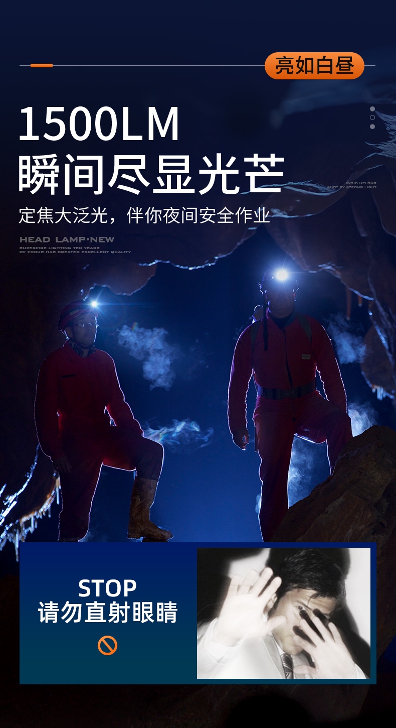 聚光主灯 亮度随心 轻按后端开关按钮,主灯强光点亮,续按依次切换主灯工作光-爆闪光。主灯开启状态下长按5秒,可实现光源色温转换。主灯关闭状态下长按5秒,可开启灯具最亮照明模式。 爆亮强光 亮如白昼 1500LM大功率高亮光源,点亮顷刻如白昼