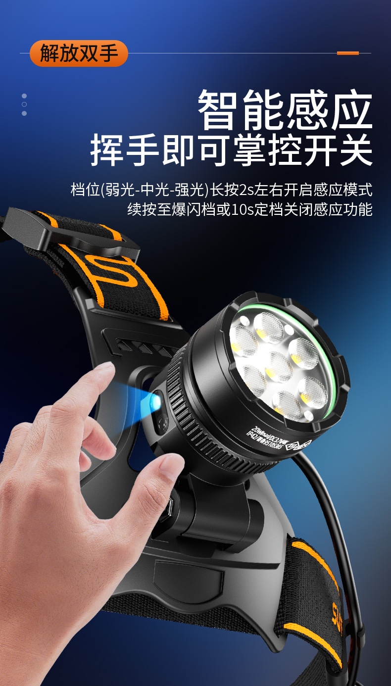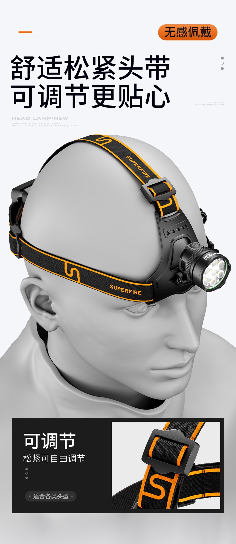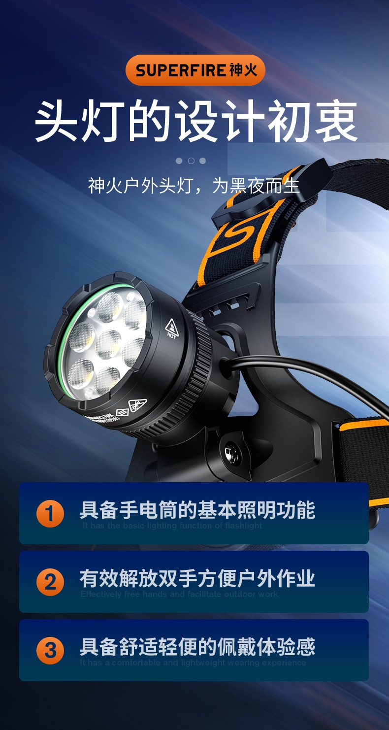 强光亮度,运动头灯,前后均衡设计,轻便不压头,可调节式头灯带,佩戴方便舒适,伸缩调焦,光照范围大,照射距离远,头灯角度调节,超90度角度随意调节,适宜各种环境使用