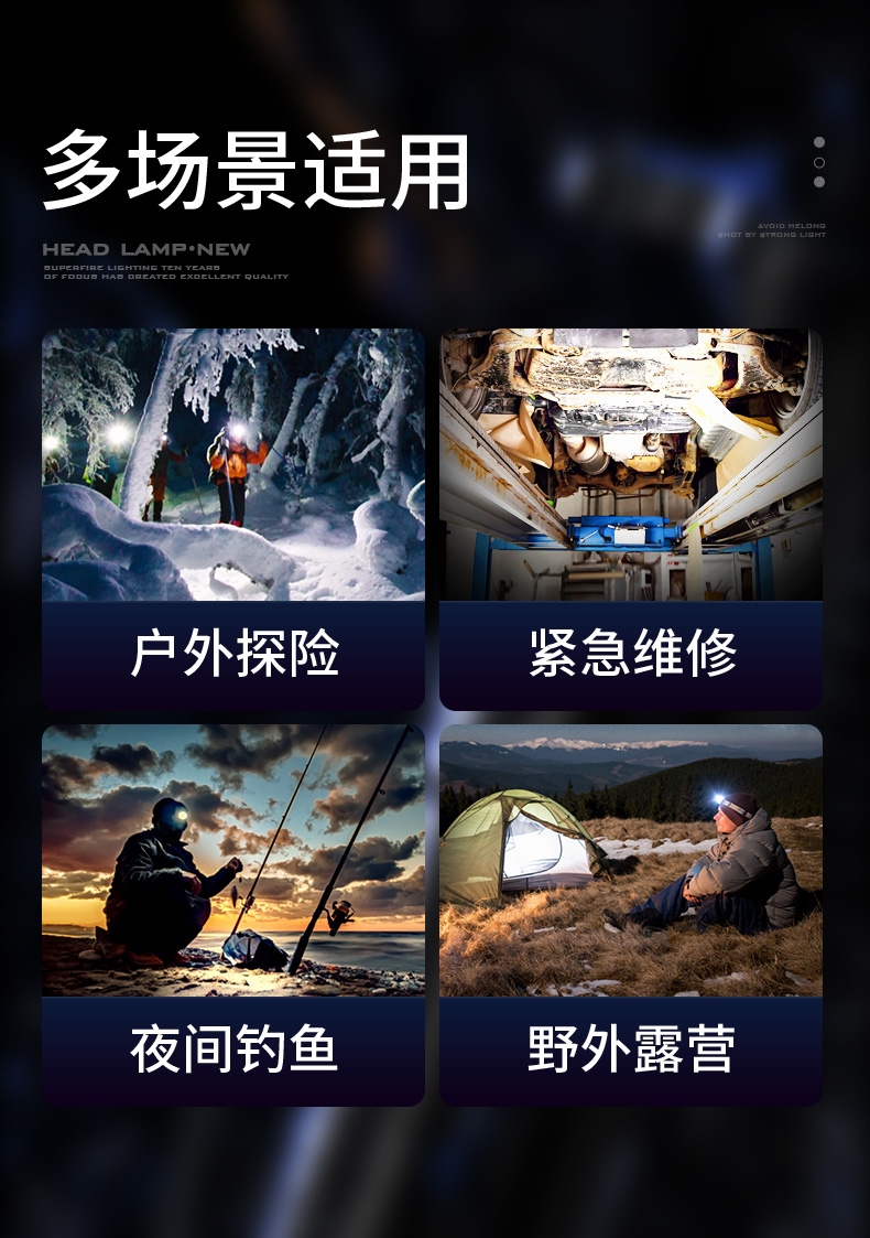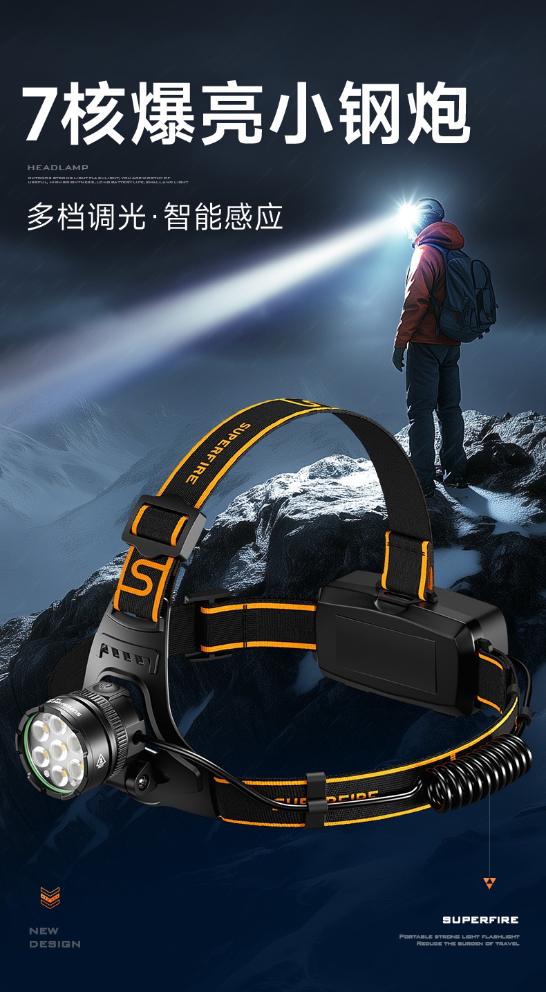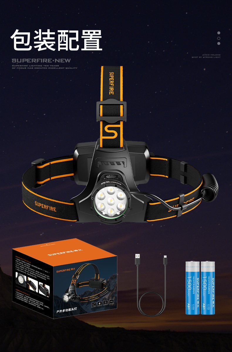 强光亮度,运动头灯,前后均衡设计,轻便不压头,可调节式头灯带,佩戴方便舒适,伸缩调焦,光照范围大,照射距离远,头灯角度调节,超90度角度随意调节,适宜各种环境使用