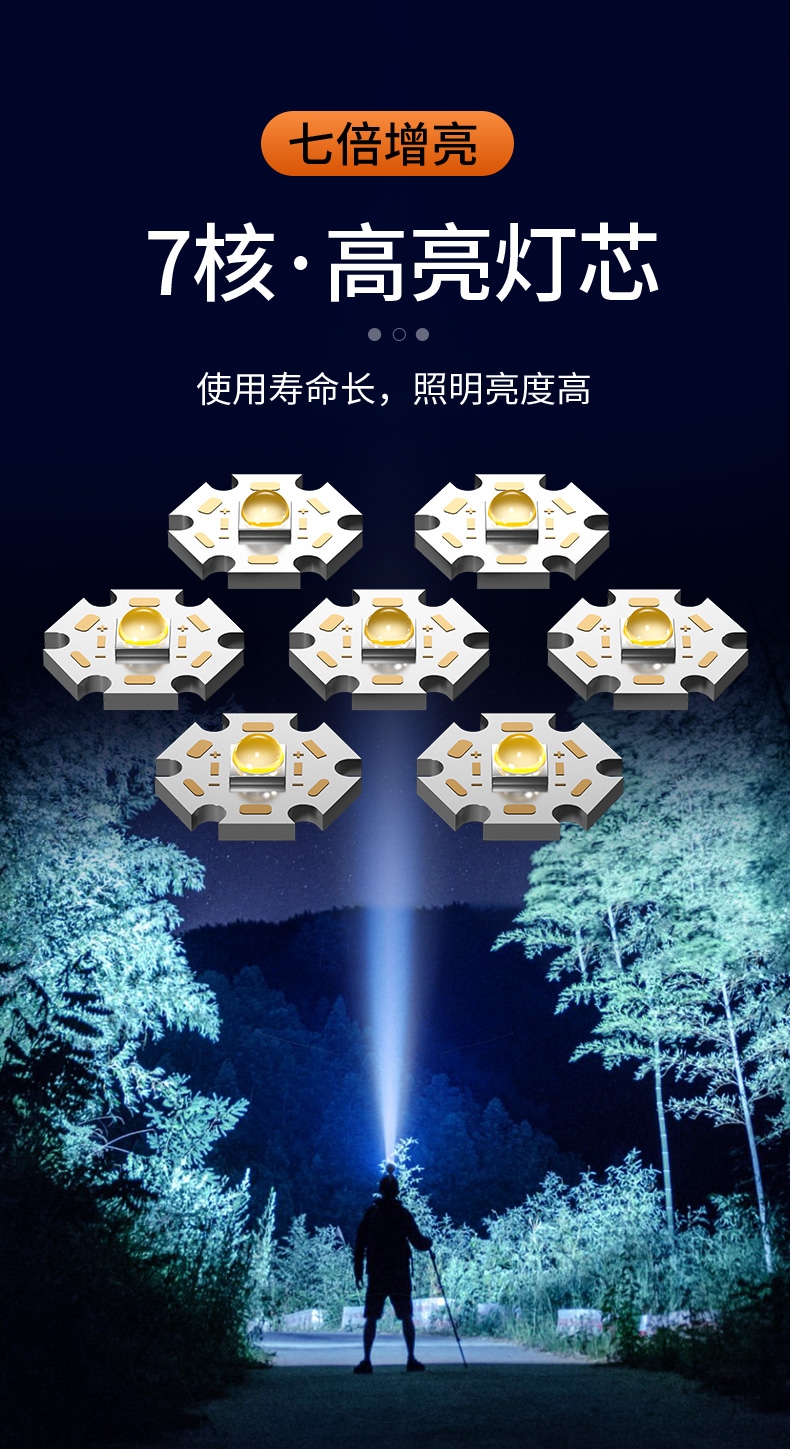 1、千米远射,射程更远,光斑更聚焦。 2、进口灯珠,亮度高,照明效果更好。 3、前后双按键,光源一键点亮,高亮瞬间开启。