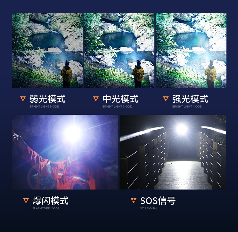 1、五档一体:弱中强、爆闪、SOS自由切换,可满足不同场景下的使用需求;