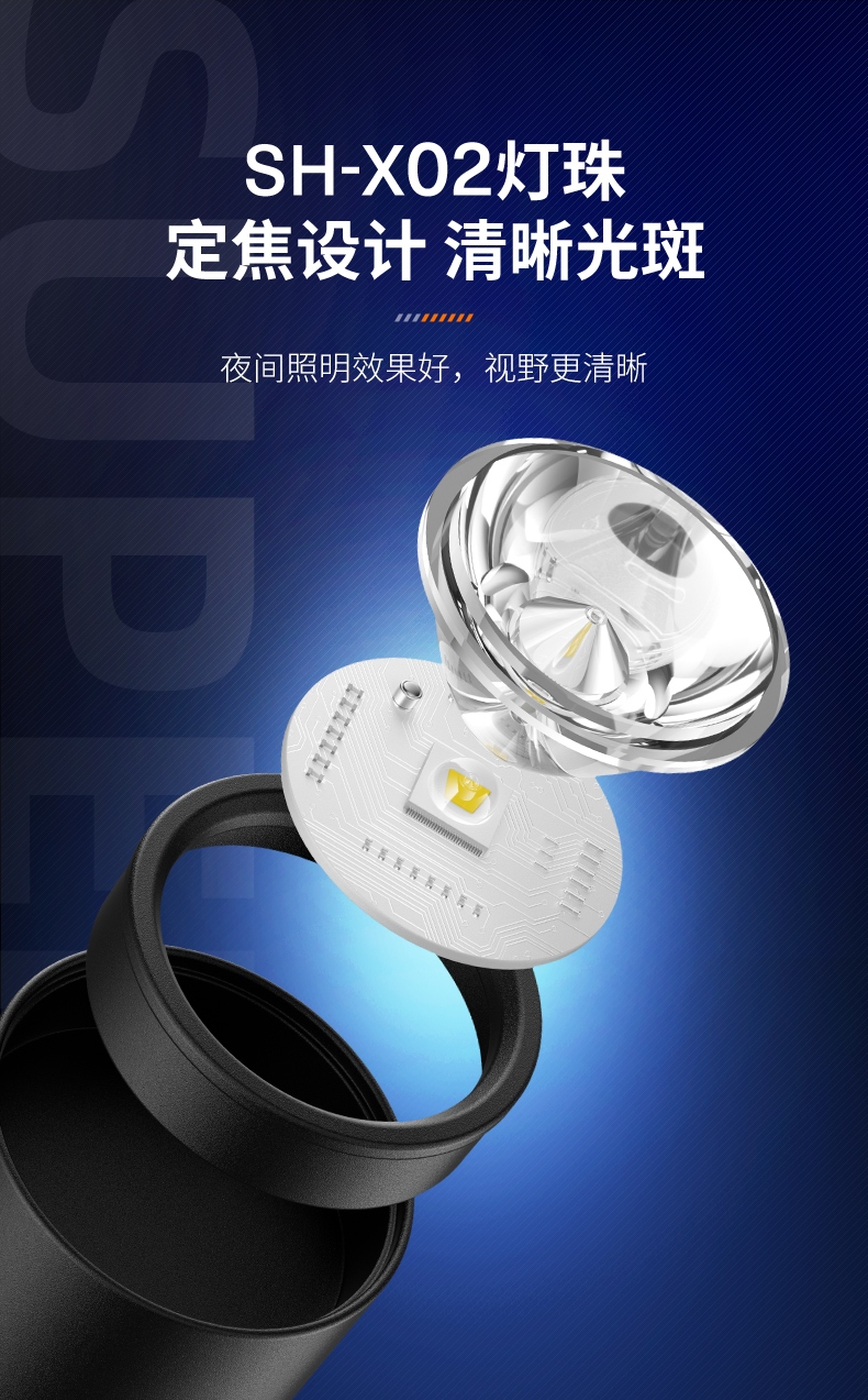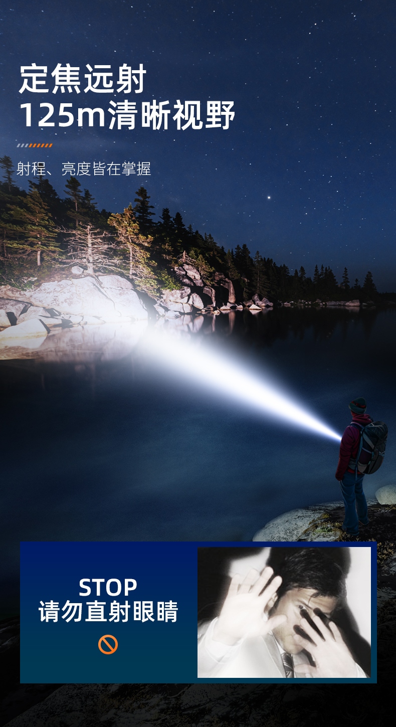 1、千米远射,射程更远,光斑更聚焦。 2、进口灯珠,亮度高,照明效果更好。 3、前后双按键,光源一键点亮,高亮瞬间开启。