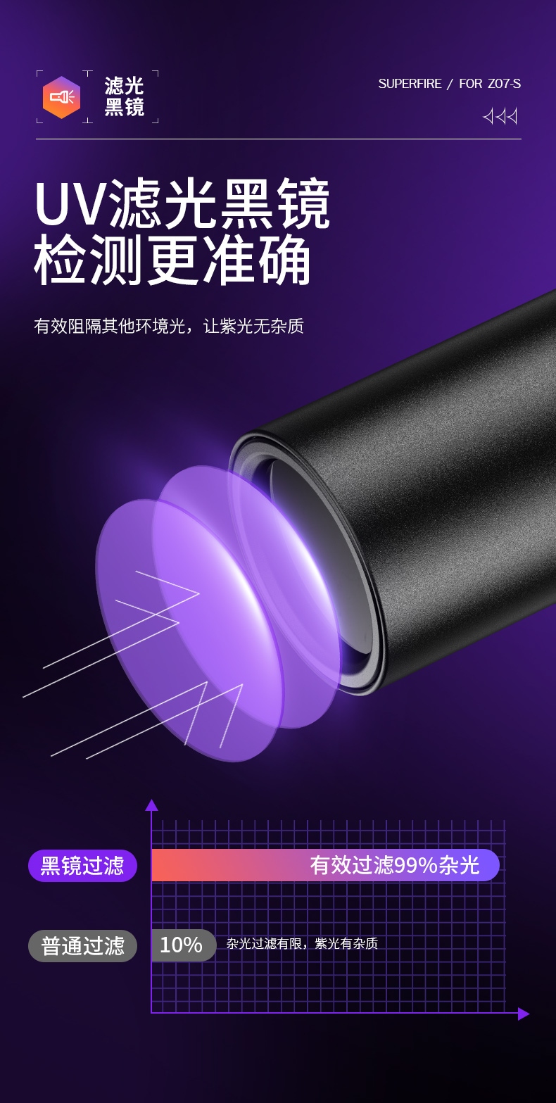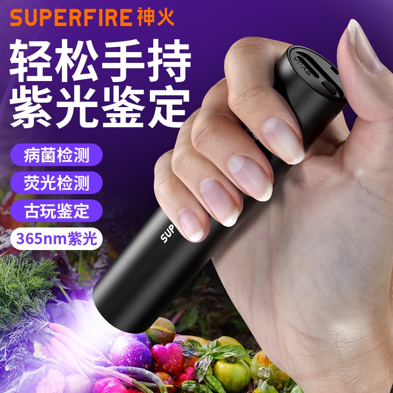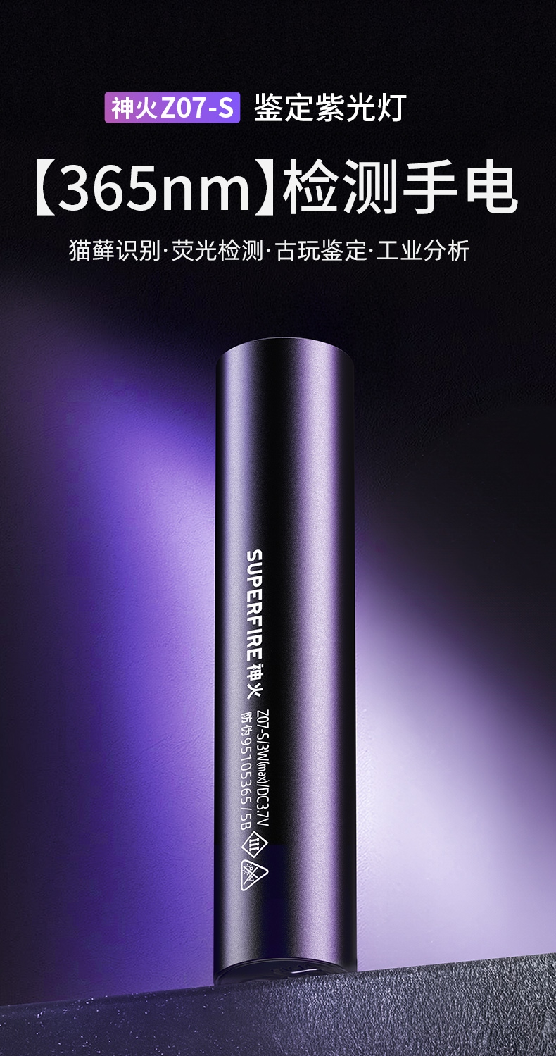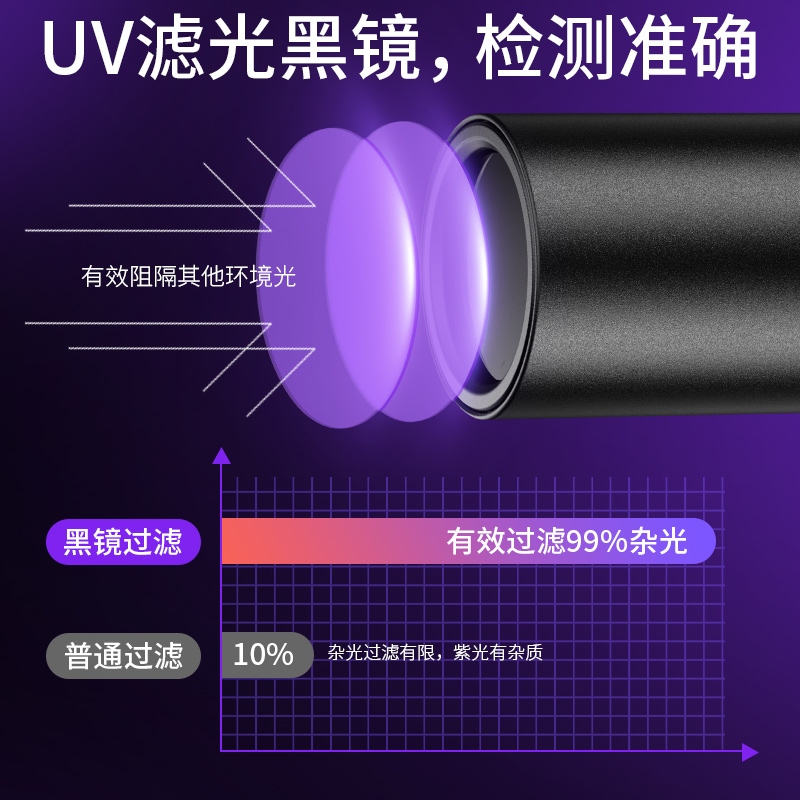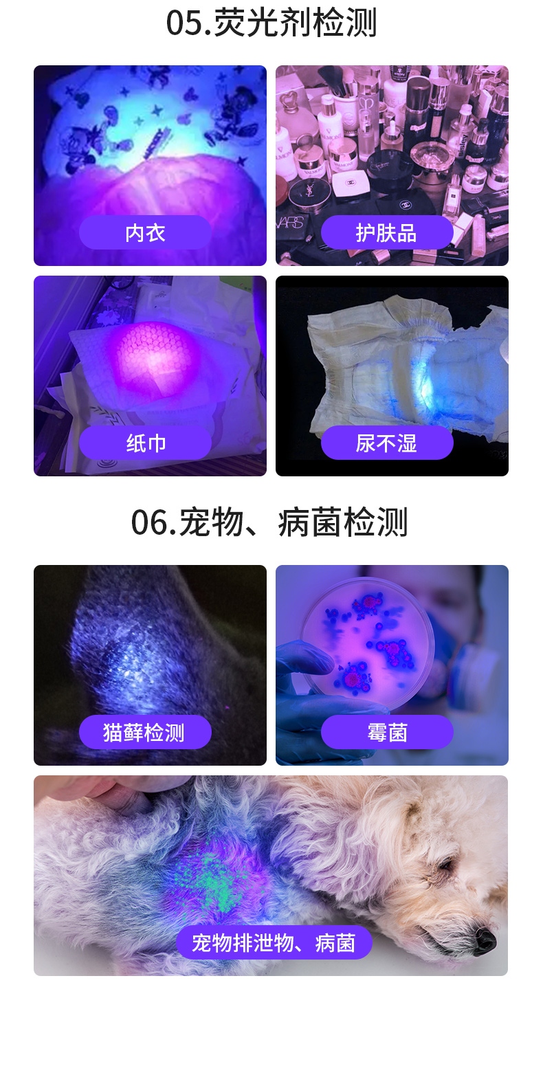 1、紫光手电:多功能,可用于验钞、识别宠物病菌、荧光检测,鉴别琥珀、蜜蜡,古玩修补鉴定、工业探伤等。 2、纯净紫光:365nm紫光,波长短,穿透性强。 3、黑镜,有有效过滤各类杂光,保持紫光纯净,更真实还原产品实际状态。