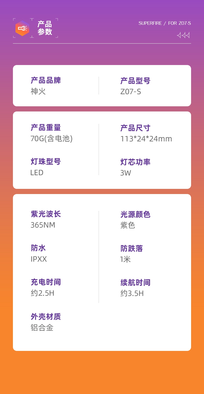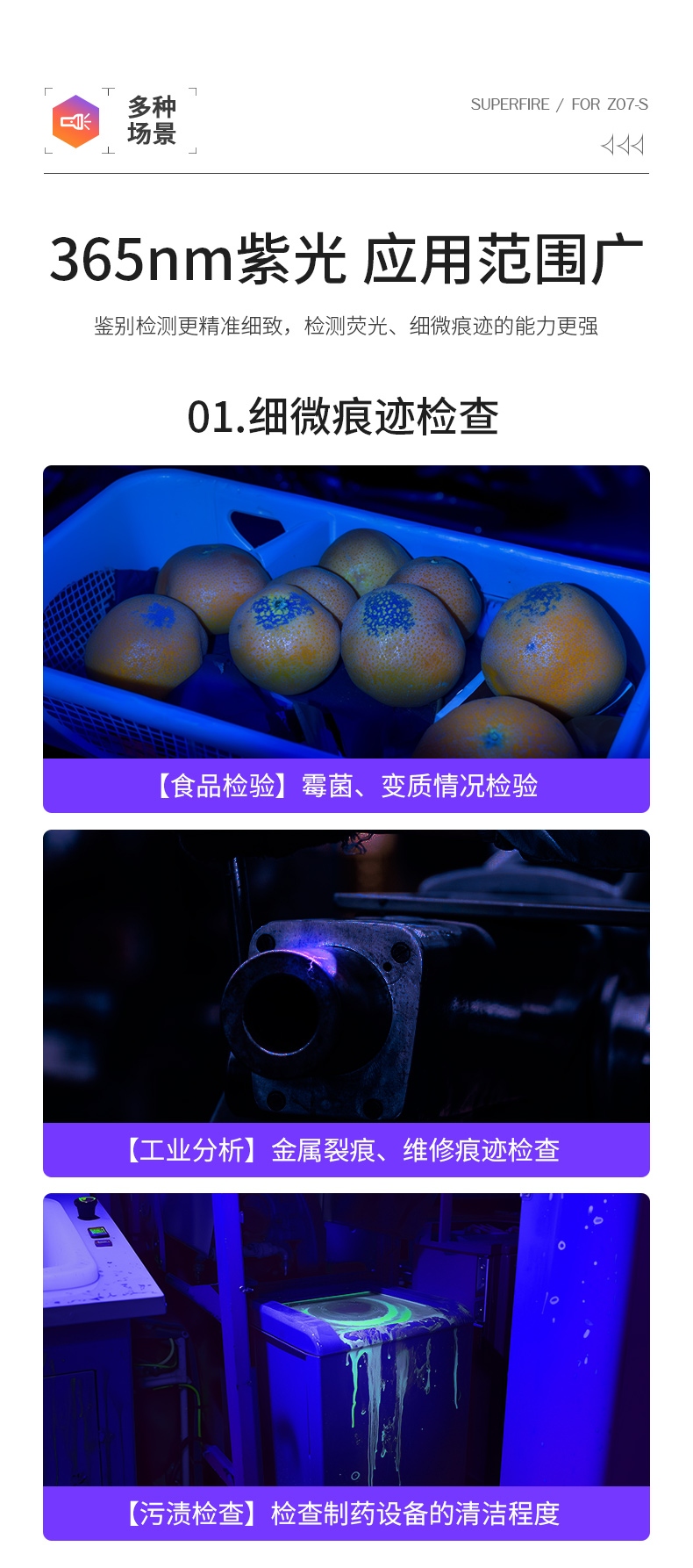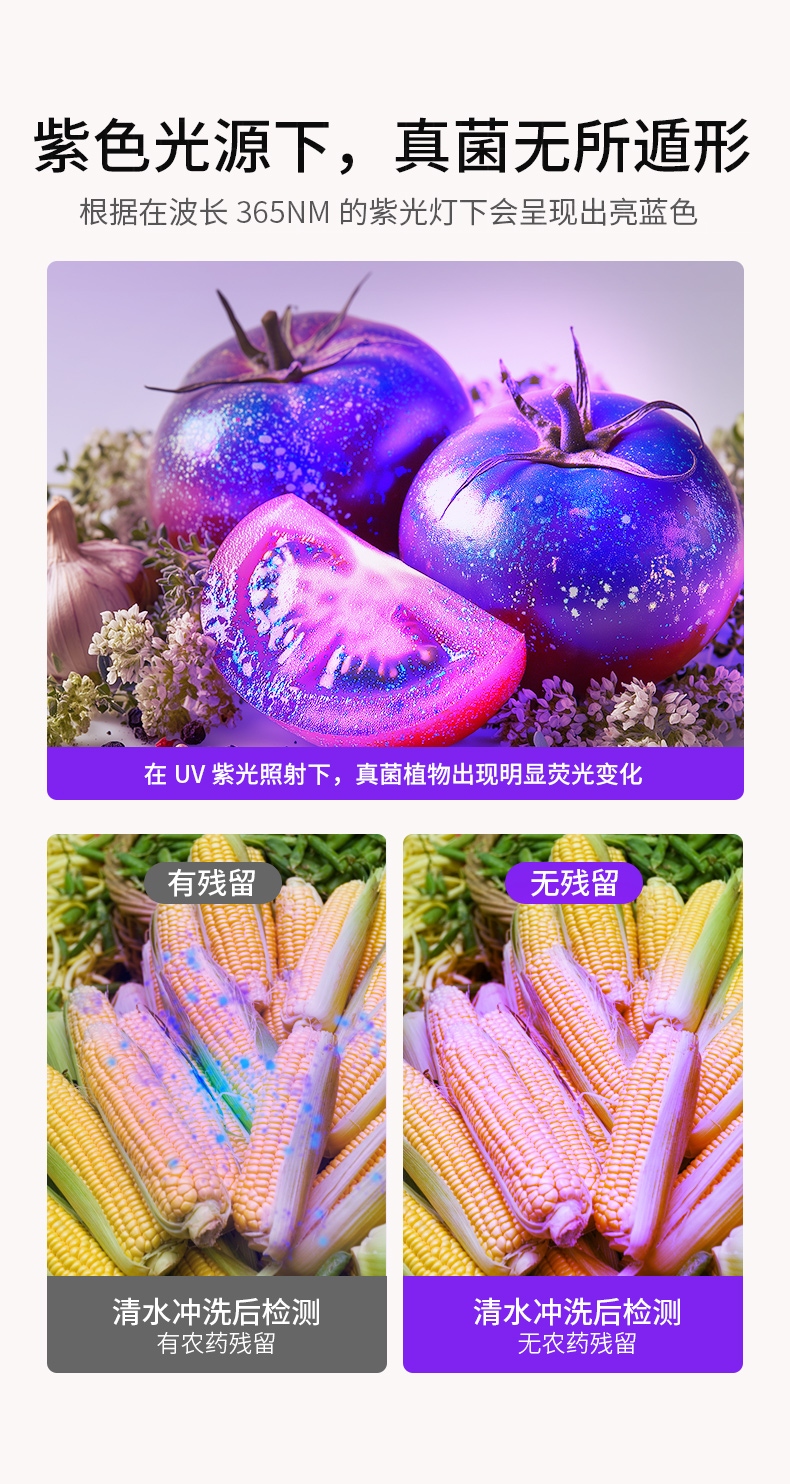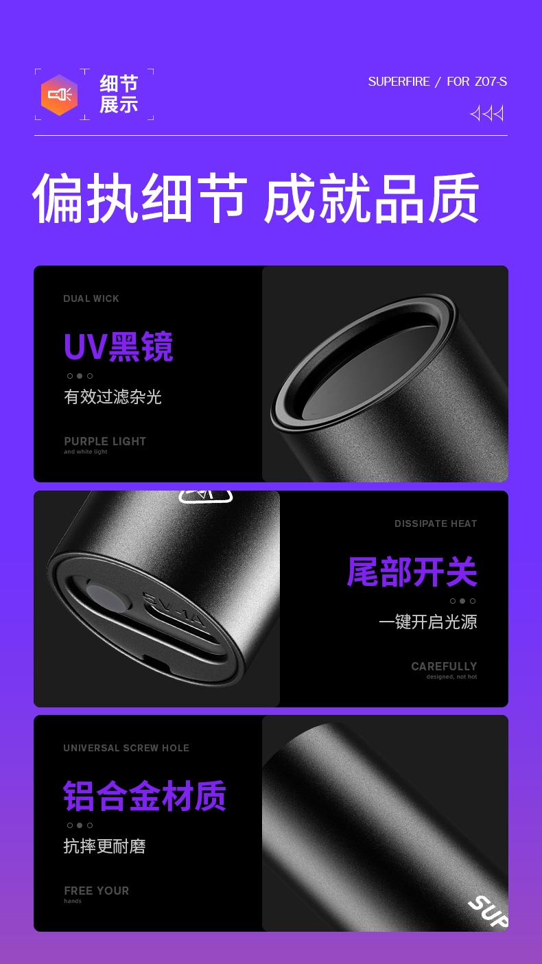 1、紫光手电:多功能,可用于验钞、识别宠物病菌、荧光检测,鉴别琥珀、蜜蜡,古玩修补鉴定、工业探伤等。 2、纯净紫光:365nm紫光,波长短,穿透性强。 3、黑镜,有有效过滤各类杂光,保持紫光纯净,更真实还原产品实际状态。