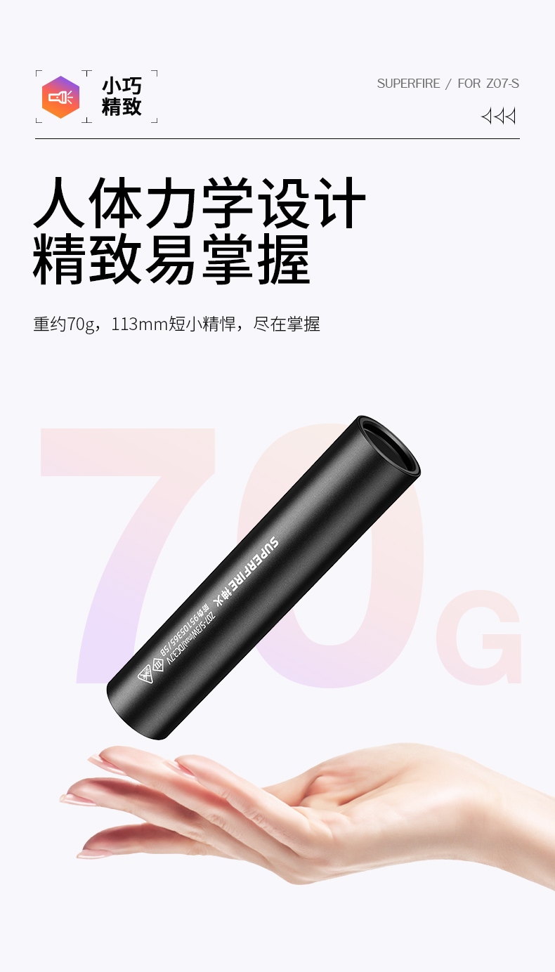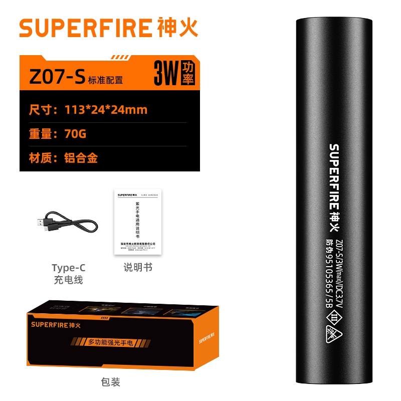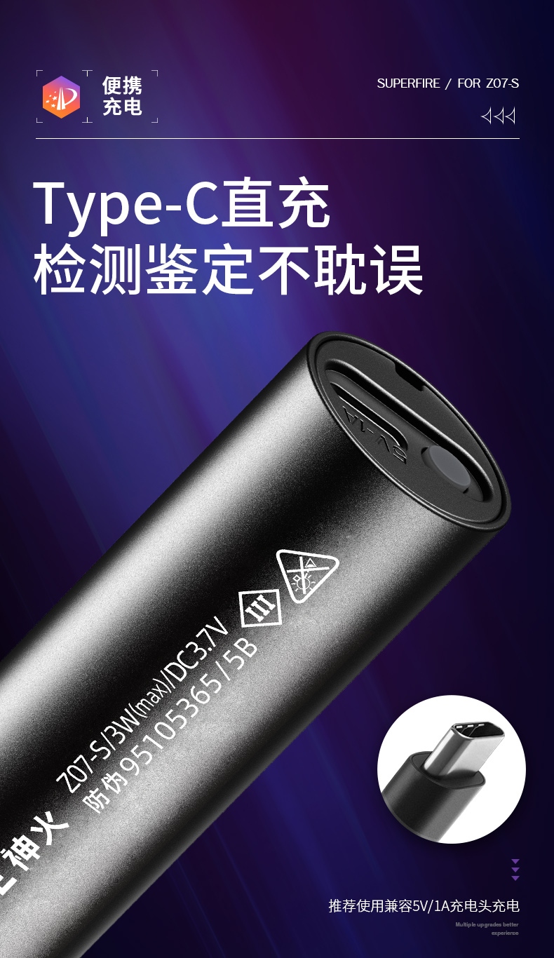 3、多样化充电,使用方便:设有Type-c充电接口,可使用充电器、充电宝、电脑等设备为手电充电。