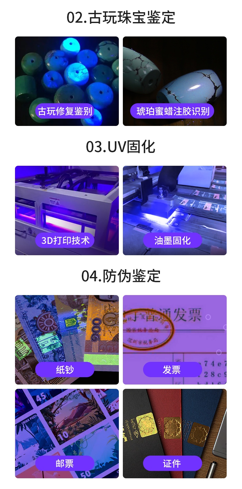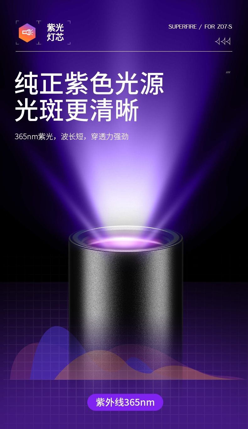 6、纯净紫光:365nm紫光,波长短,穿透性强。