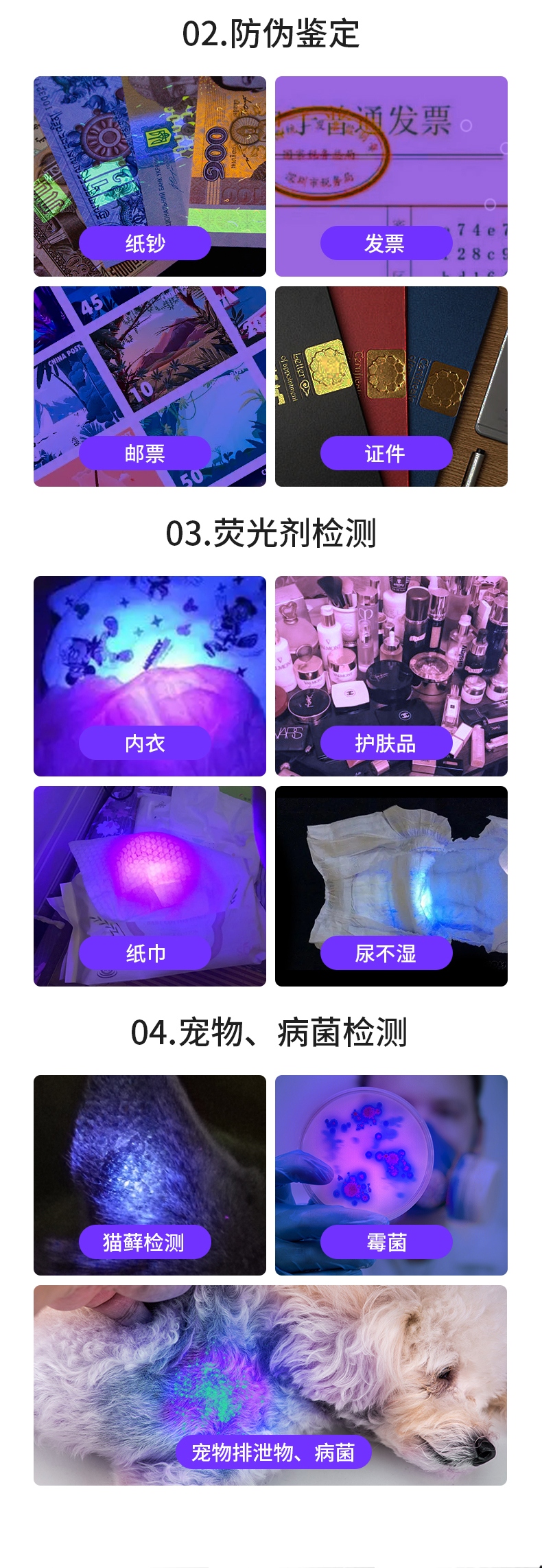 1、紫光手电:可用于验钞、识别荧光剂,宠物荧光检测,鉴别琥珀、蜜蜡,古玩修补鉴定。