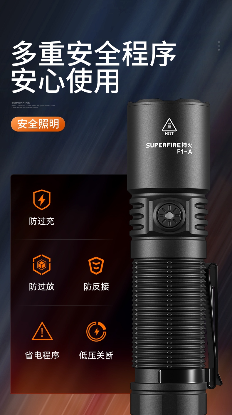 1、多档调光,可满足不同使用场景下的照明需求。 2、多种安全程序,可有效保护手电使用安全,延长手电使用寿命。 3、定焦手电,单手操控,简单方便。