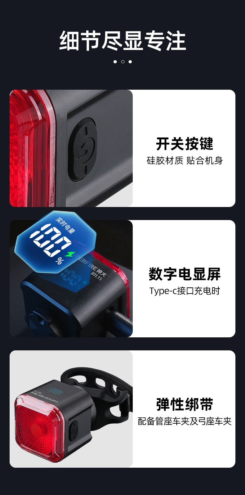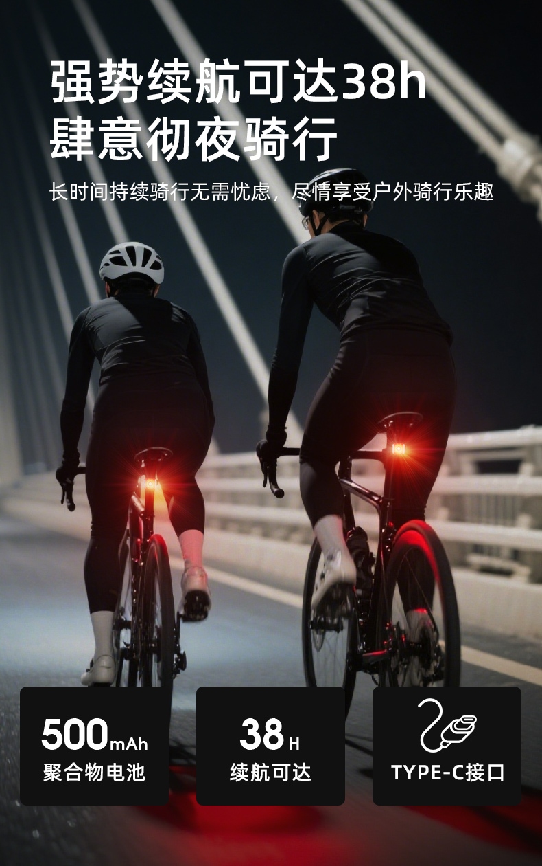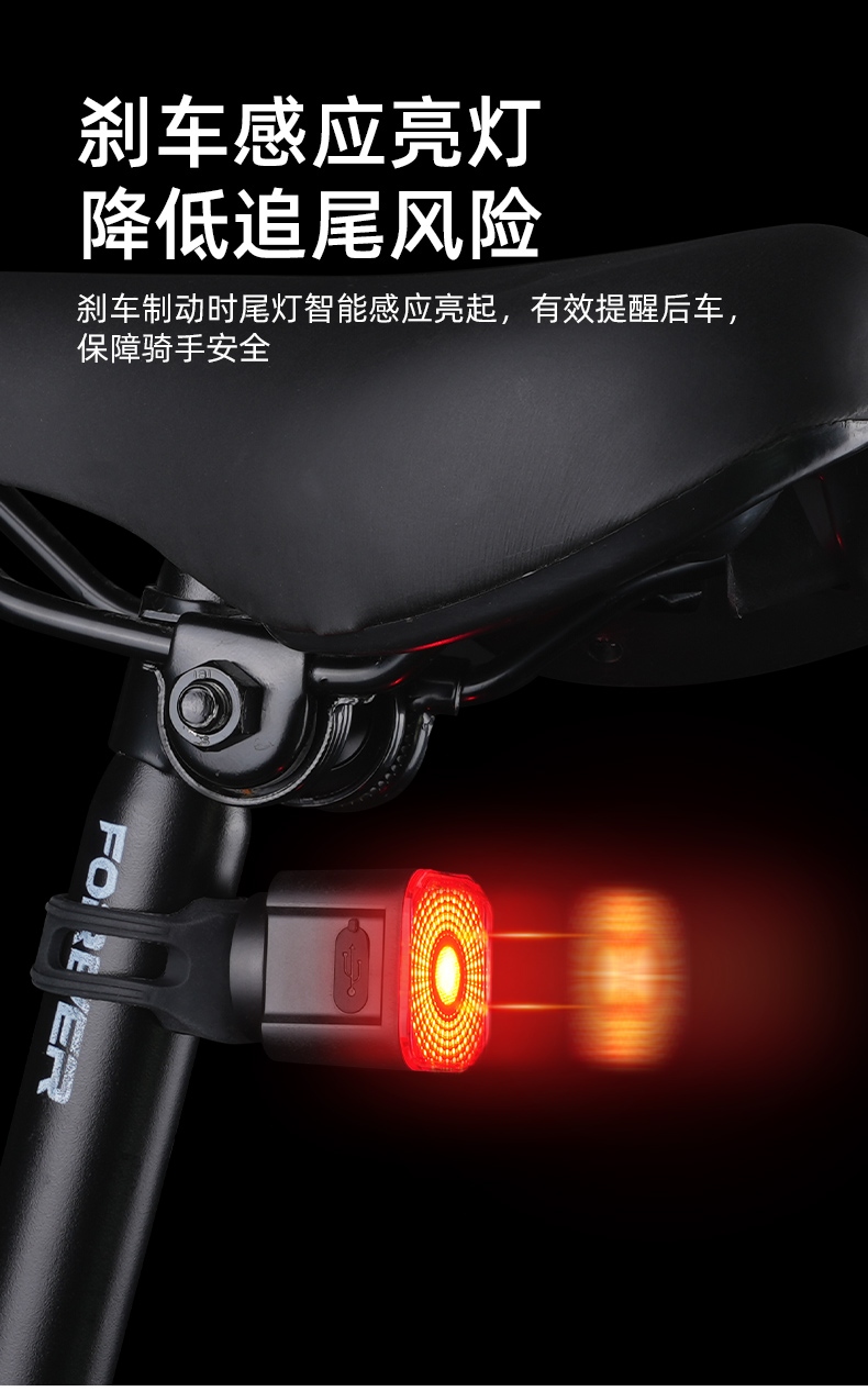 1、长按1.5秒开/关机,单击切换挡位:常亮一快闪一呼吸闪一单闪一爆闪-心跳闪; 2、刹车感应:刹车感应会随灯具开启自动启动,灯具关闭是也随之关闭; 3、自动启停:灯具静置40S左右会自动熄灭,检测到运动后自动亮起。