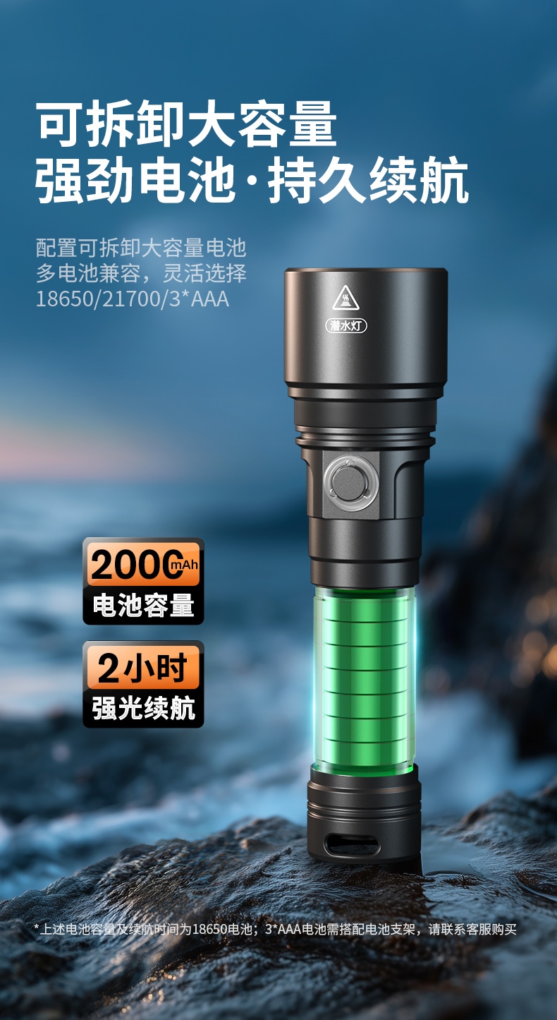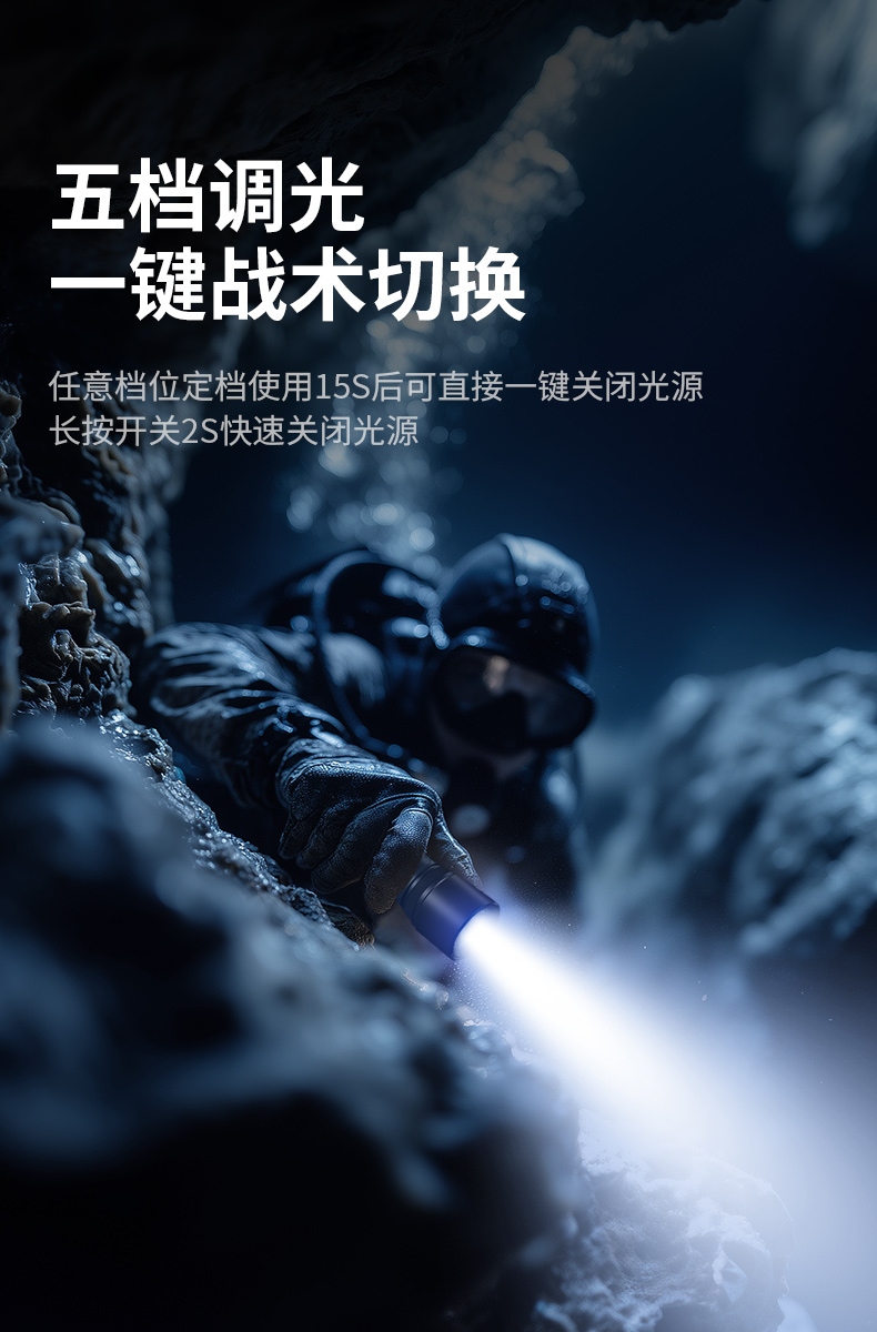 便携开关操作:按钮式设计,即使穿戴潜水手套也能轻松操作,同时具备多种光照模式切换功能。