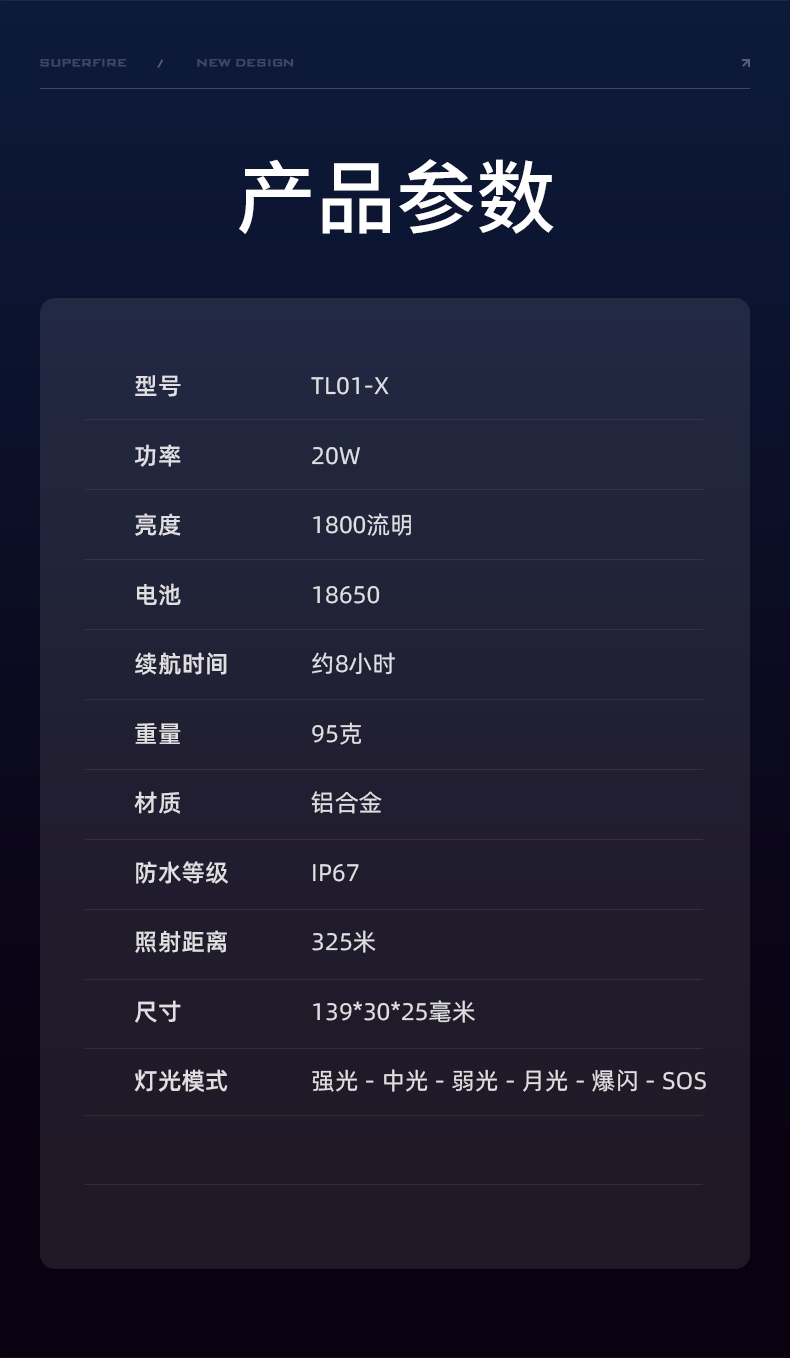 聚光主灯 亮度随心 轻按后端开关按钮,主灯强光点亮,续按依次切换主灯工作光-爆闪光。主灯开启状态下长按5秒,可实现光源色温转换。主灯关闭状态下长按5秒,可开启灯具最亮照明模式。 爆亮强光 亮如白昼 1500LM大功率高亮光源,点亮顷刻如白昼