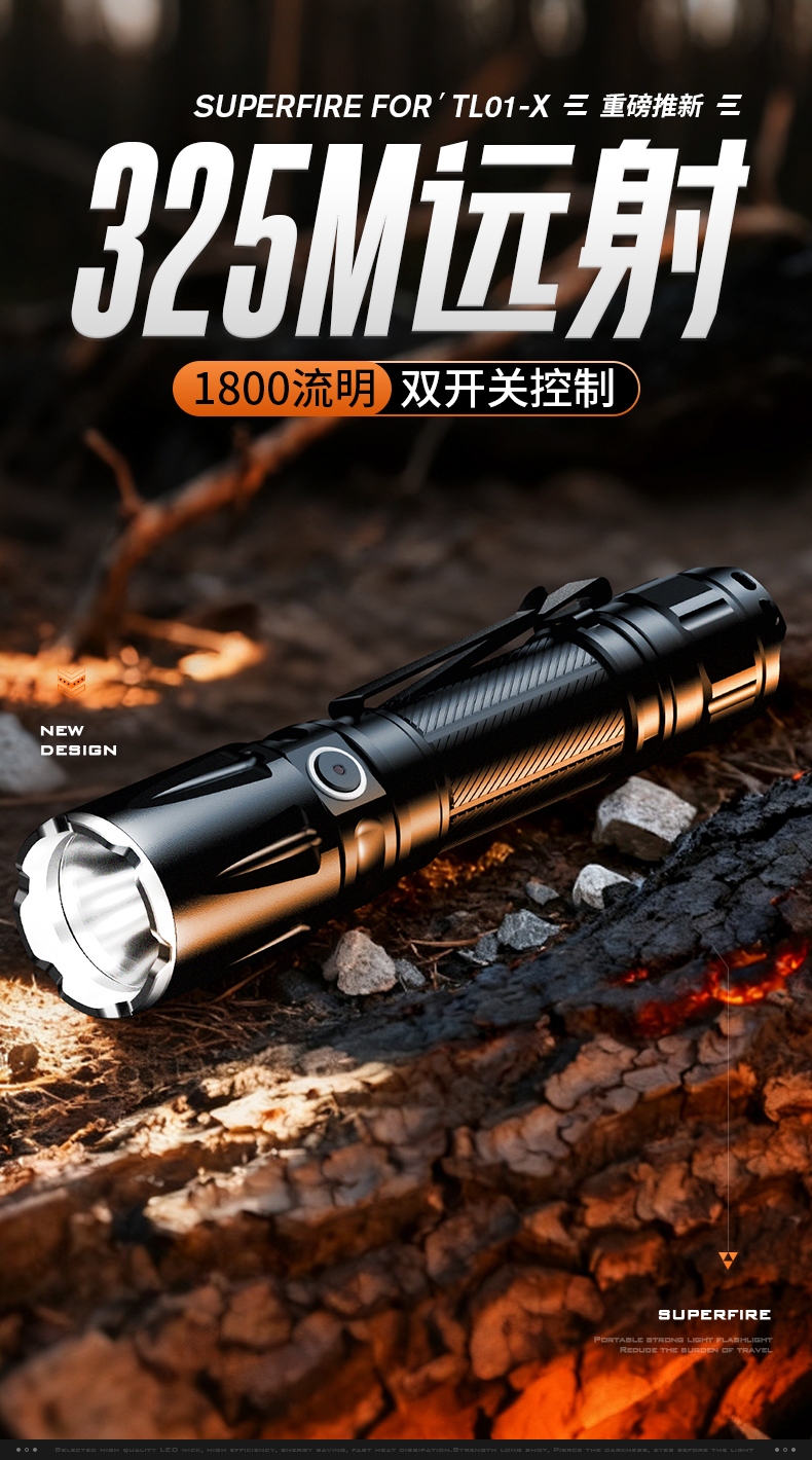 1、千米远射,射程更远,光斑更聚焦。 2、进口灯珠,亮度高,照明效果更好。 3、前后双按键,光源一键点亮,高亮瞬间开启。