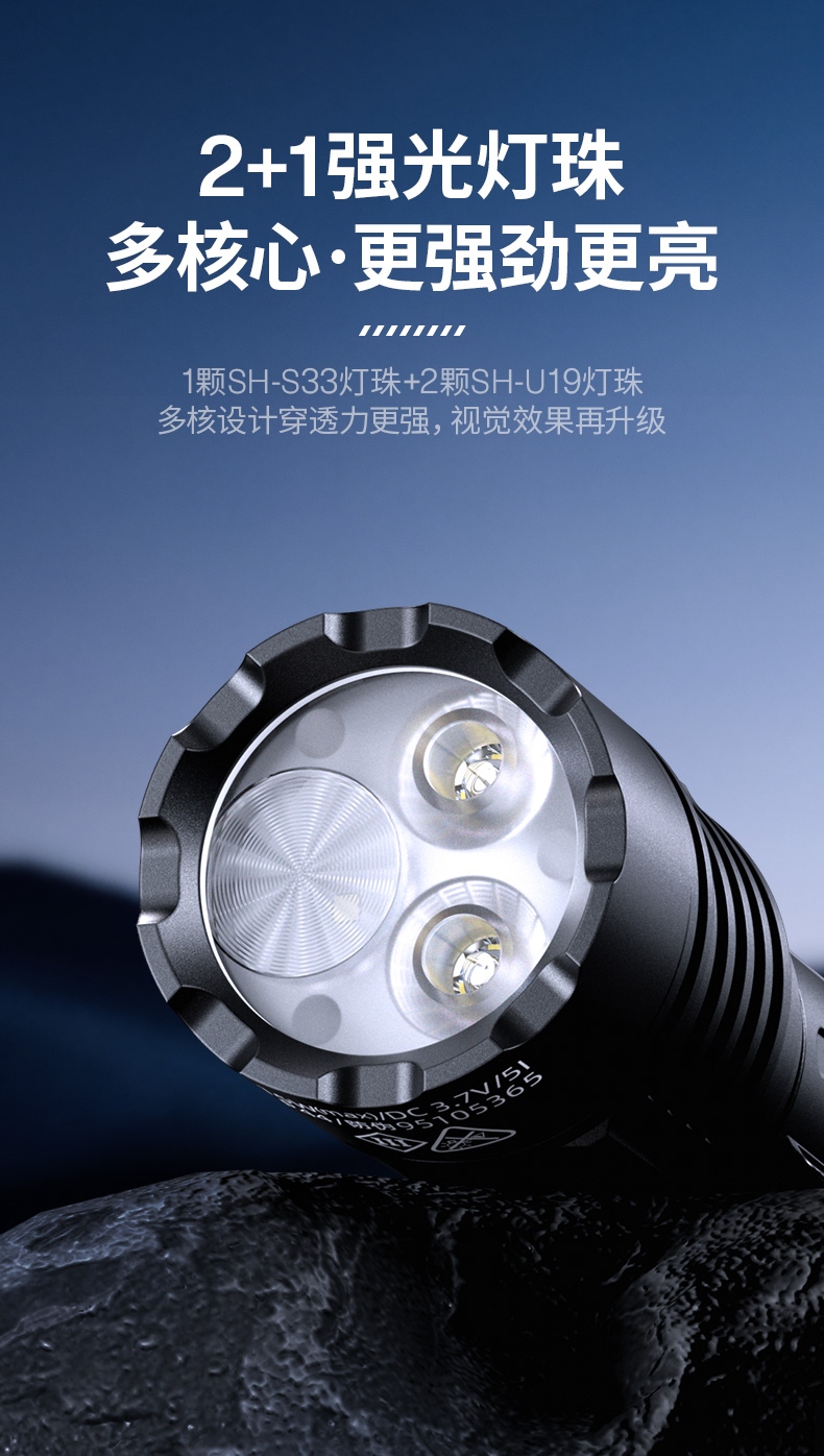 1、千米远射,射程更远,光斑更聚焦。 2、进口灯珠,亮度高,照明效果更好。 3、前后双按键,光源一键点亮,高亮瞬间开启。