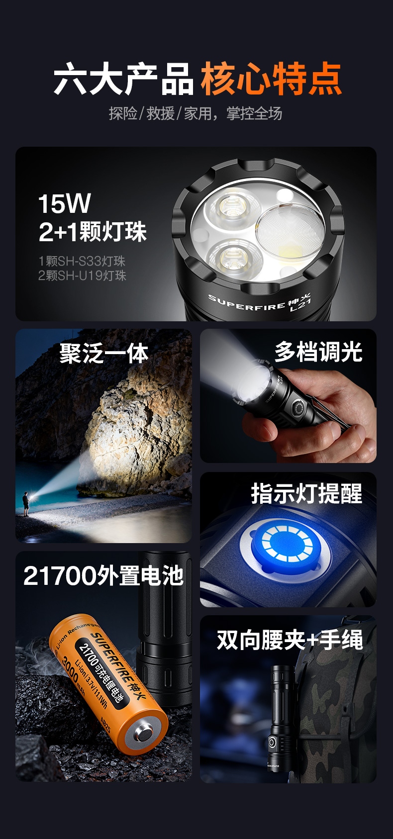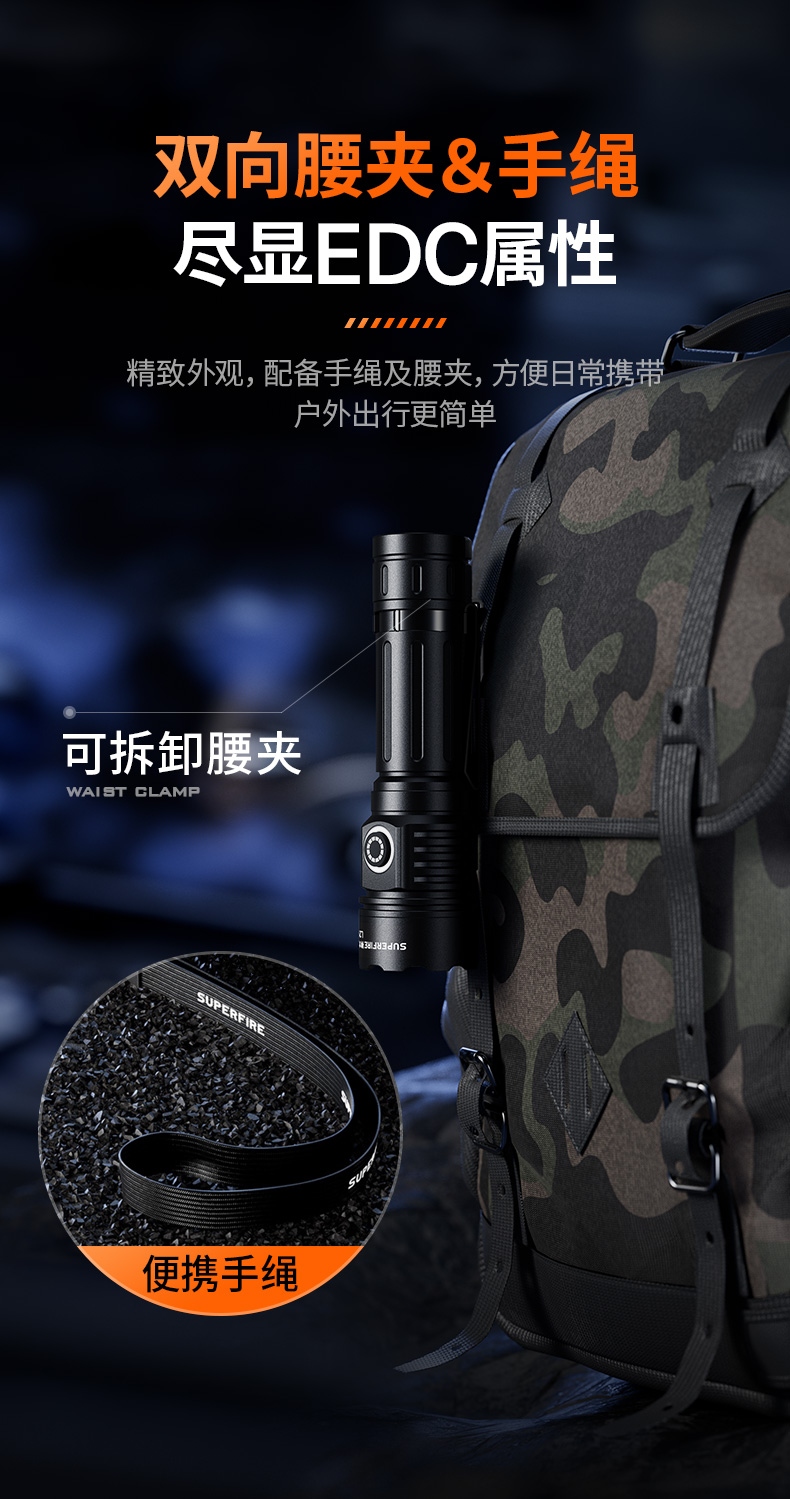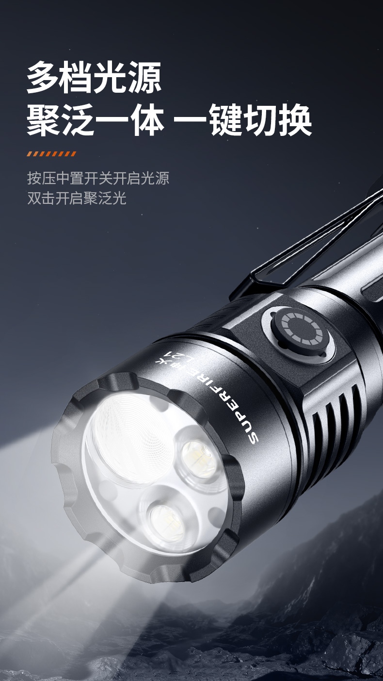 1、多档调光,可满足不同使用场景下的照明需求。 2、多种安全程序,可有效保护手电使用安全,延长手电使用寿命。 3、精致外观,时尚小巧。